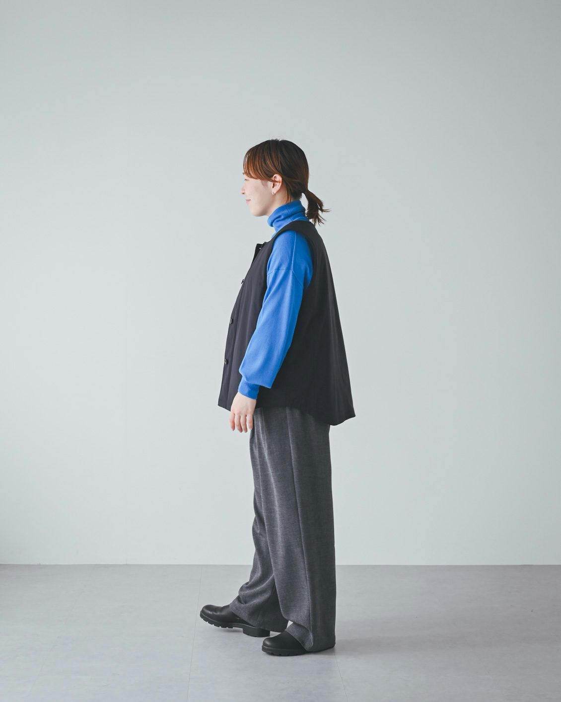 今回着用したブラックはやや浅い色味の黒だから、全身が重く見えないところもいいなと思います。このベストとコートのセットがあれば、今すぐ着れて、その後の冬、春も、かなり助かりそうです」
