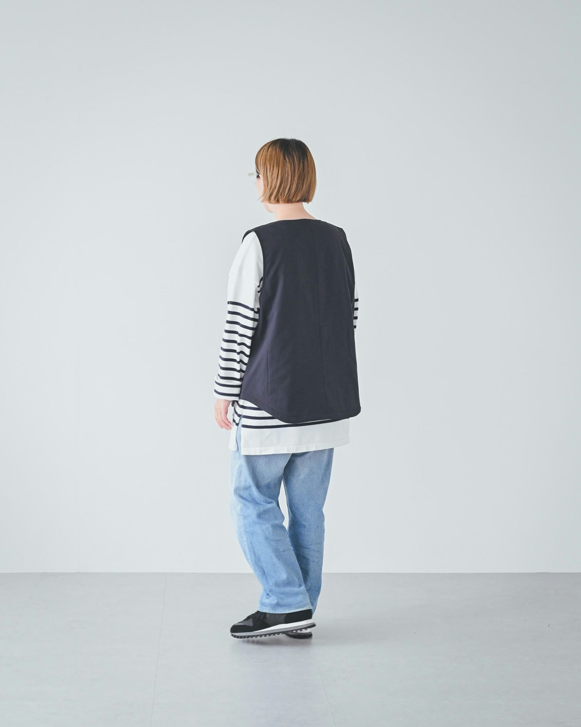 「Sサイズのベストは、お尻が半分隠れる丈。身幅にゆとりがあるので、ラグランスリーブのスウェットの上から着ても窮屈感はなく、余裕がありました。