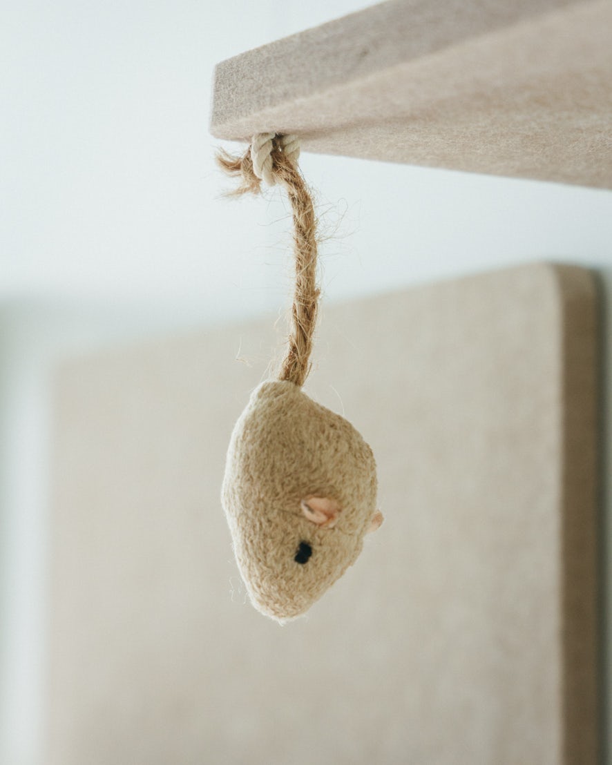 ▲猫が渡れる「ブリッジ」を設置するためのループに、チャイのお気に入りのネズミのぬいぐるみをぶら下げて、「これで遊んでくれるかな?」と谷さん。