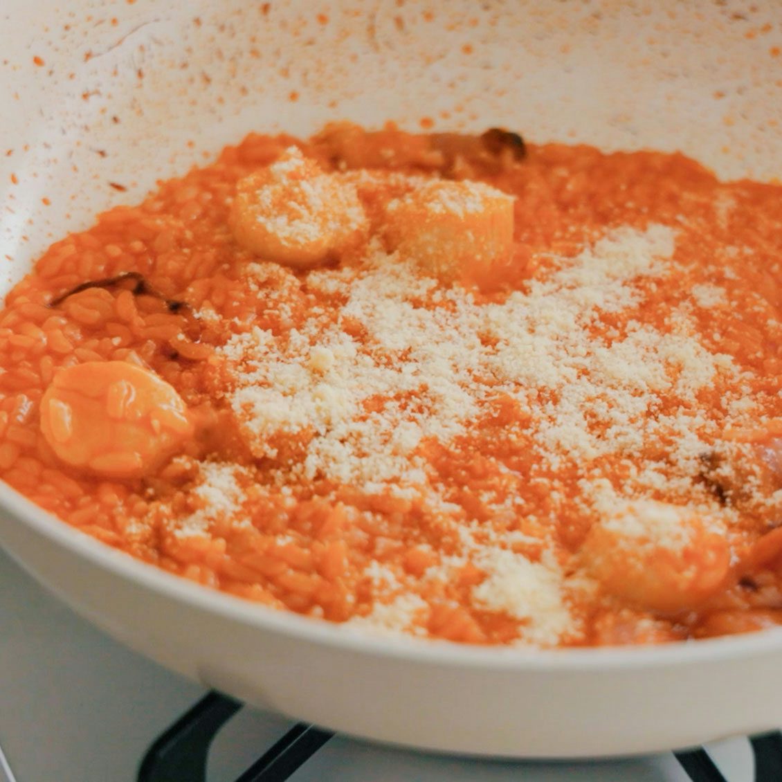 4:ルッコラ、パルメザンチーズを入れて泡が落ち着くまで煮詰めたらソースは完成