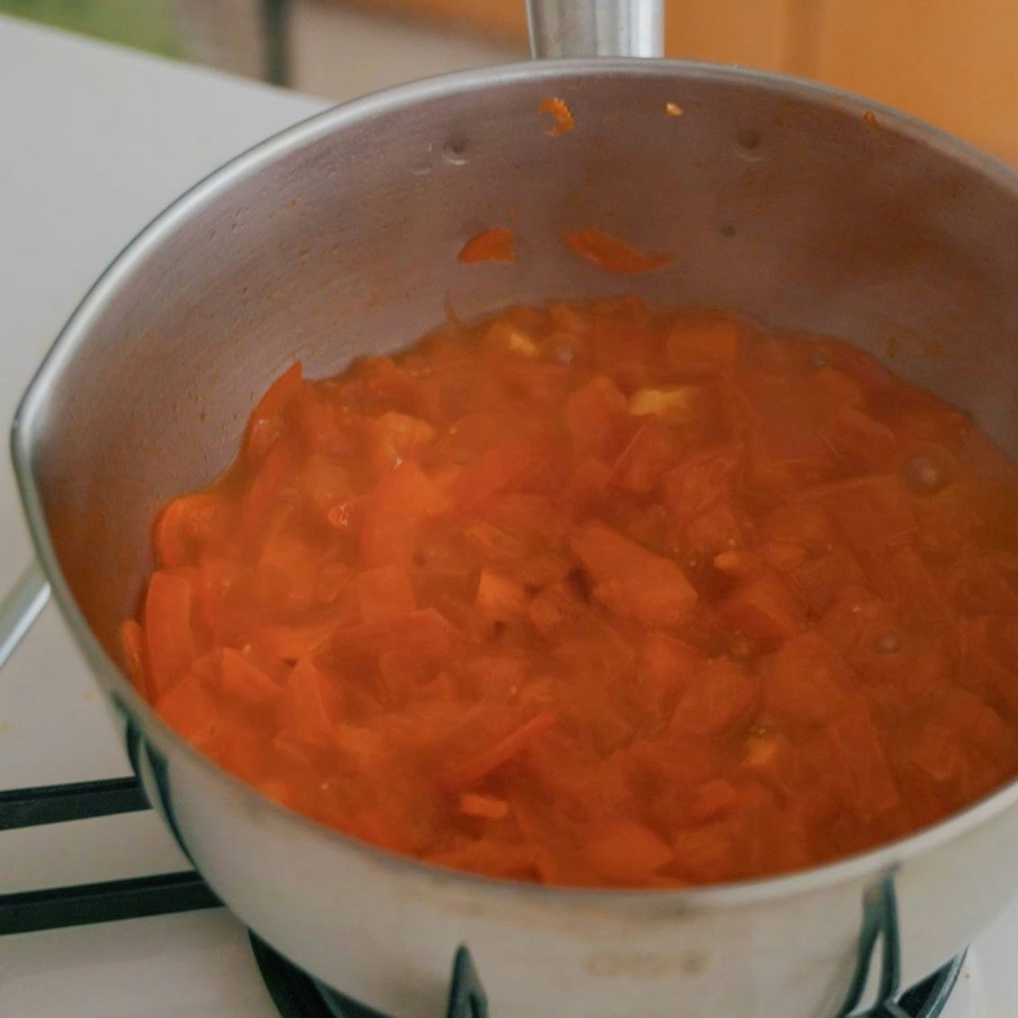 3:トマト、塩ひとつまみ、水50mlを加えて軽く混ぜ、中火でしっかり煮立てる。再度ふたをして弱火~弱めの中火で10分蒸し煮をし、トマトをつぶして味をみながら塩でととのえる。