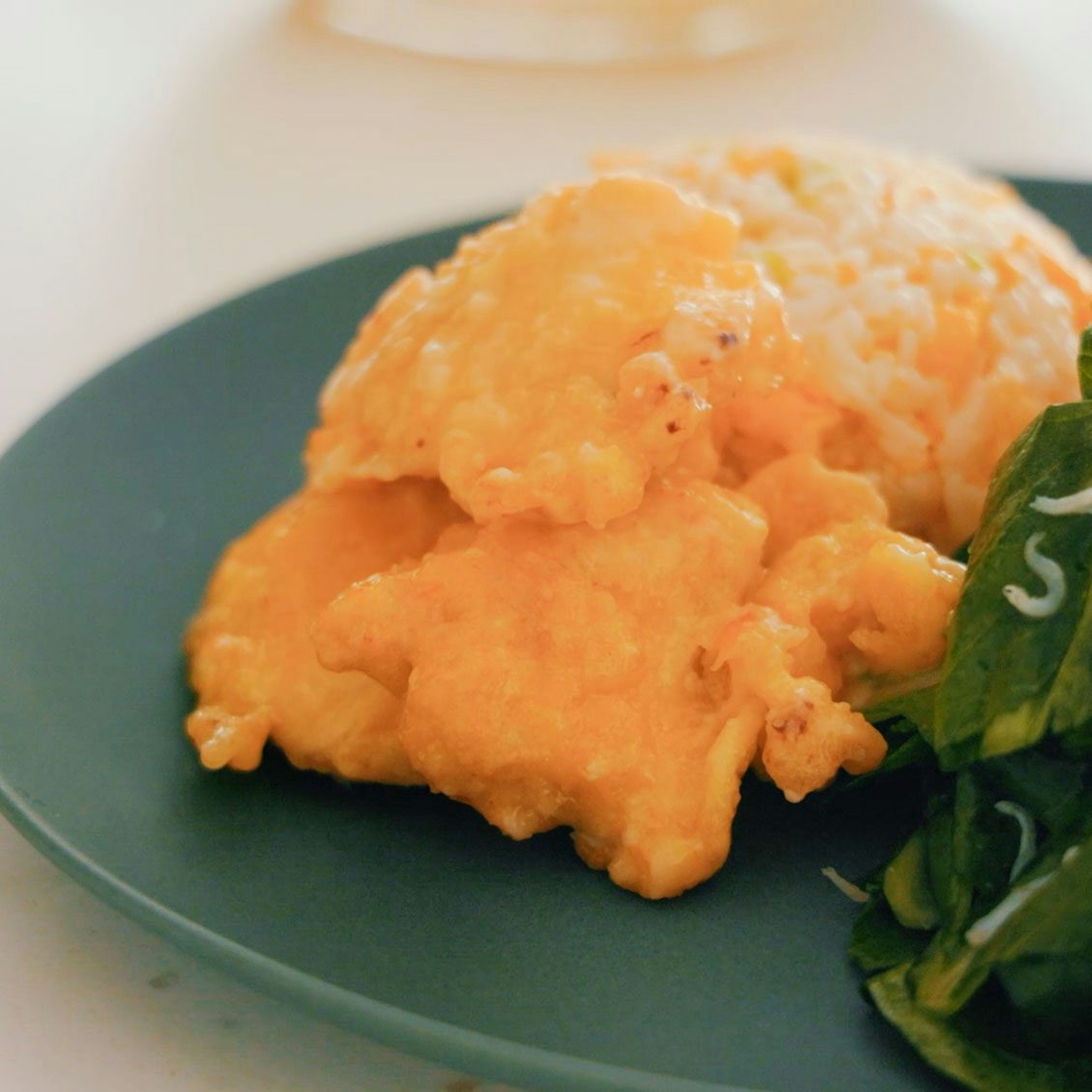 4:フライパンに底から1cmほどの油を注ぎ、中火にかけ、2を入れる。余ったころもは袋の端を切って鶏むね肉にかける。2分ほど揚げて下側がかたまってきたらひっくり返し、3分ほど弱めの中火で揚げる。火を強めころもがカリッとするまで両面揚げたらバッドに取り出して油を切る
