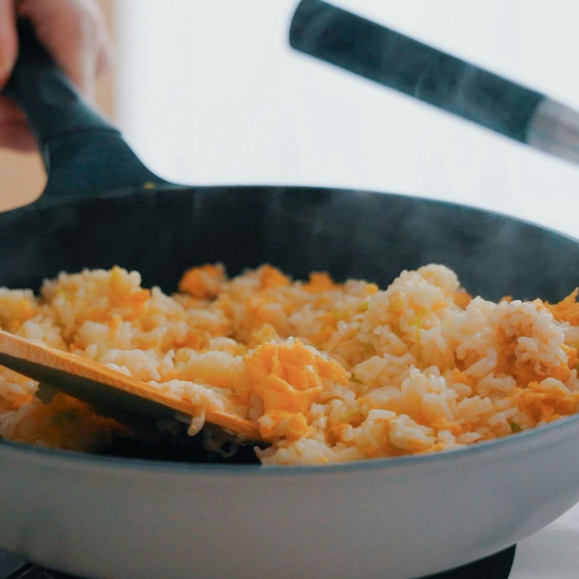 4:合わせておいたBを3のフライパンに入れて弱めの中火にかけ、ぱらっとするまで2~3分炒める