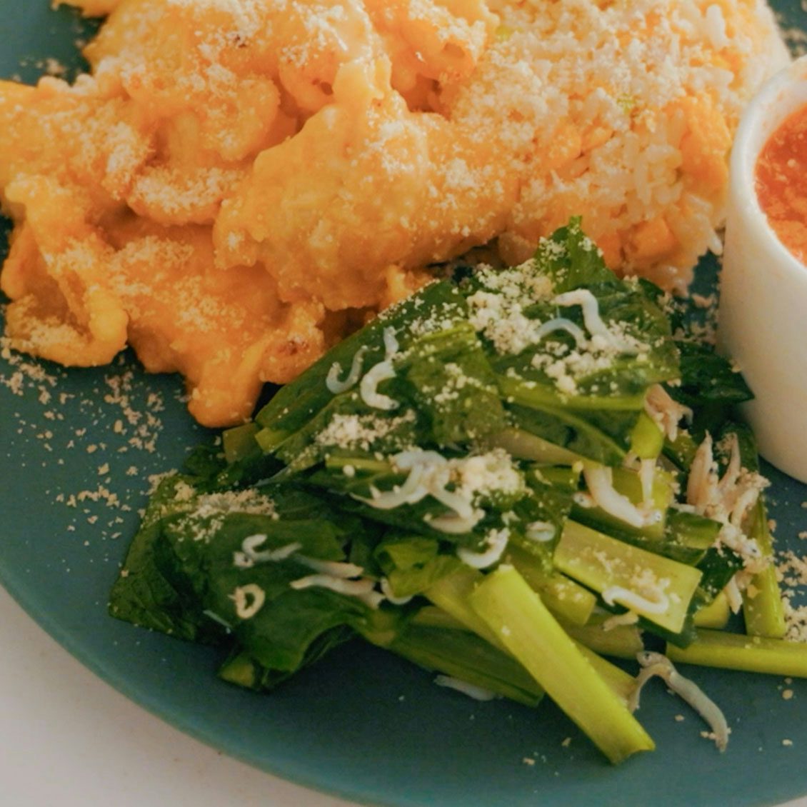 2:フライパンにごま油を入れて中火で熱し、温まったらしらすを入れチリチリと音が鳴るまで炒める