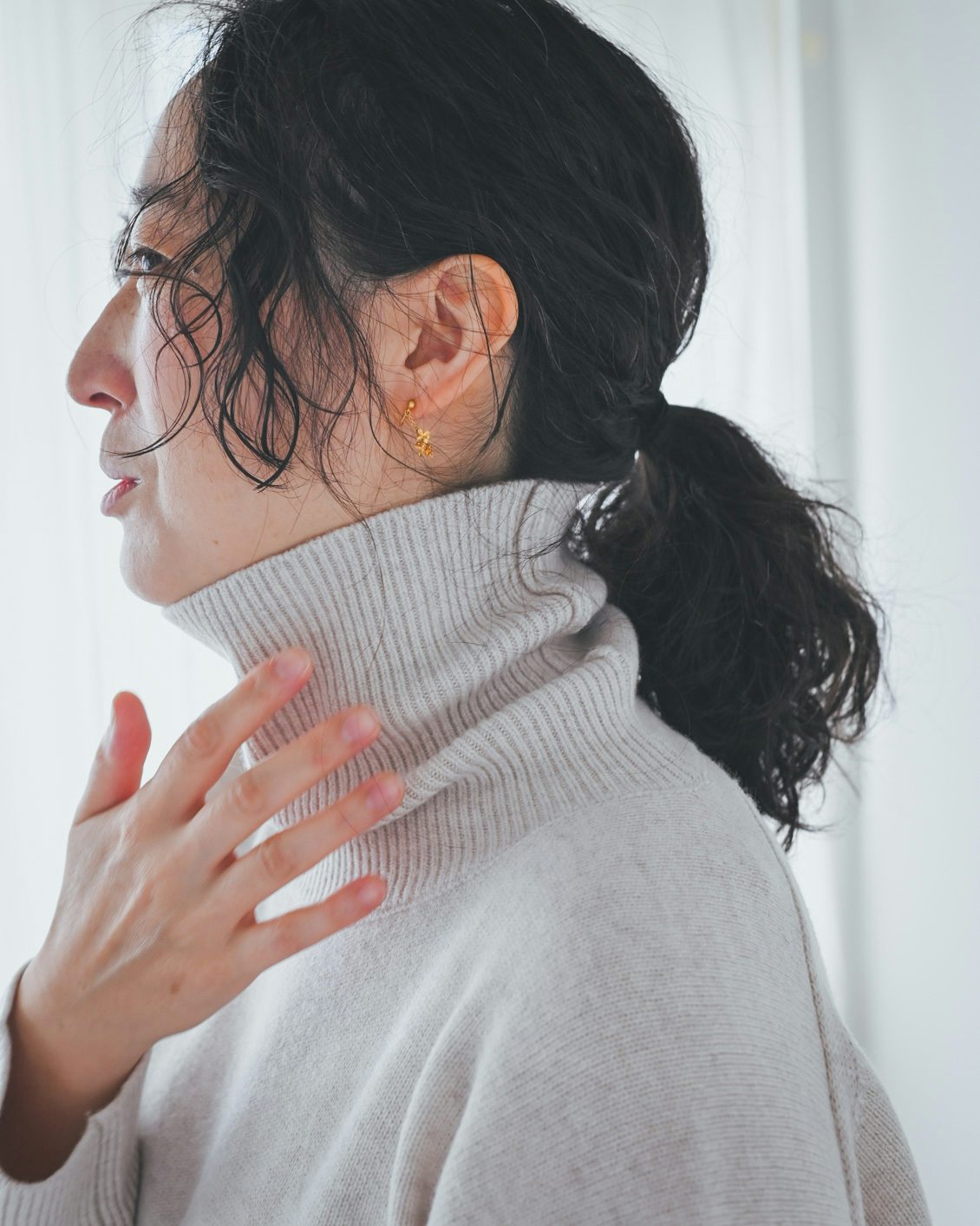 「このタートルネックは、自然とたわみが出る、編み地の柔らかな感じが、本当にいいなと思います。