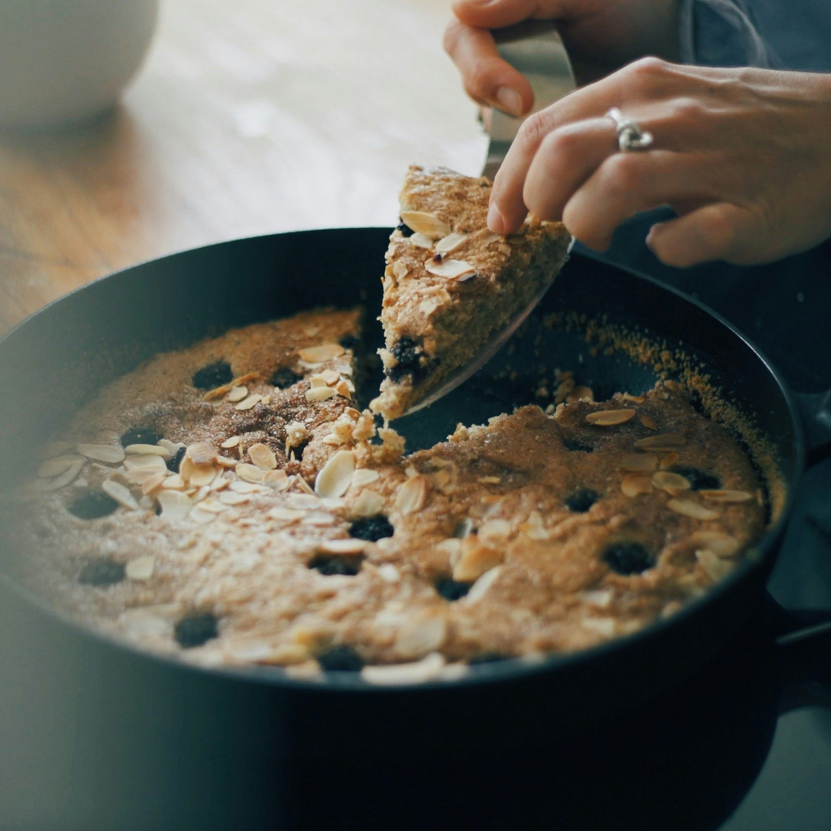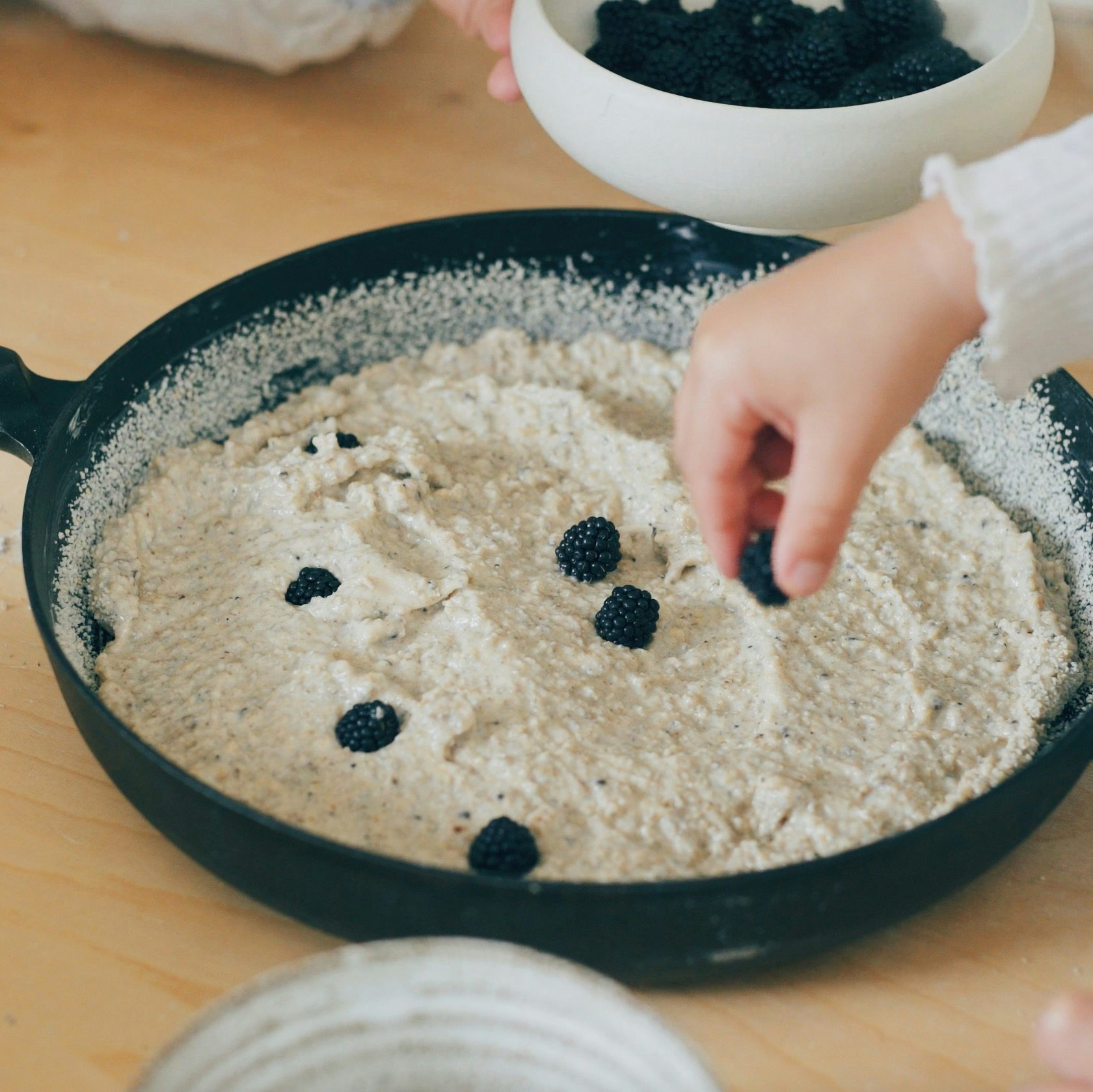 6. 型に生地を注ぎ、お好みでベリーやシナモン、砂糖、アーモンドスライスなどをトッピング