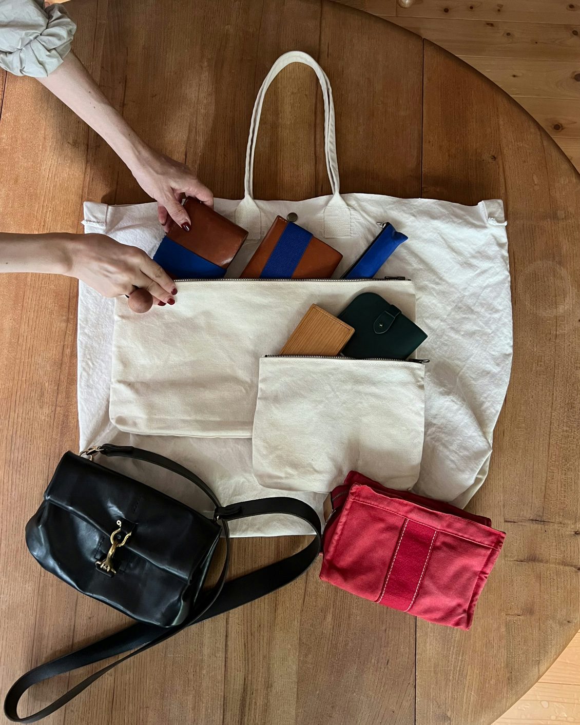 「白い帆布のトートとポーチは、友人が手がけるブランド 『gram』 のもの。カジュアルながら、どんな装いにも自然と馴染んでくれます。容量もたっぷりで、仕事の日、イベント準備で動きまわる日も、このバッグがひとつあれば心強いです。
