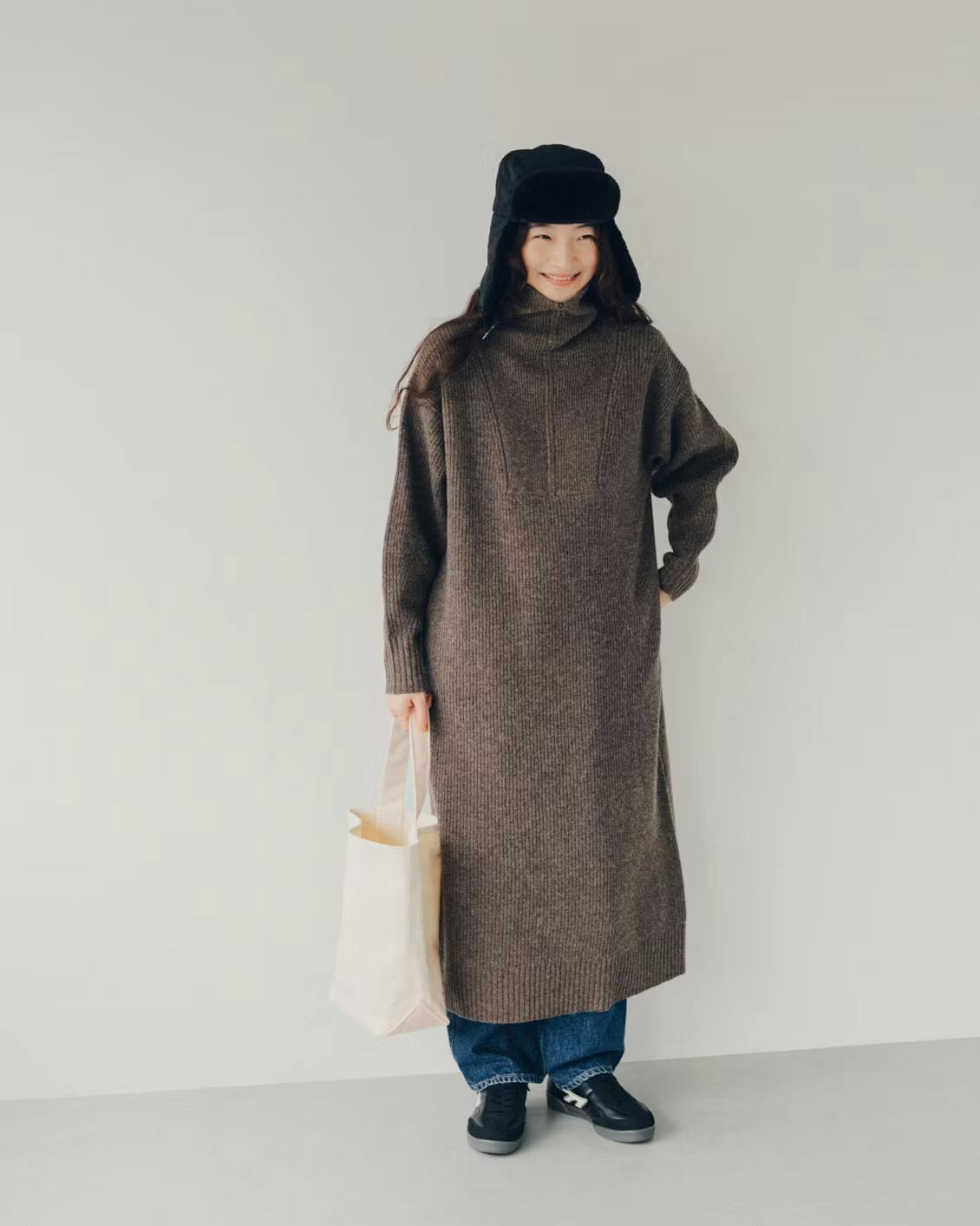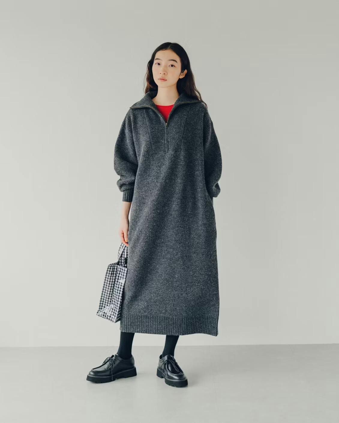 ついコーデがマンネリになりがちな季節でも、たまにはふわっと一枚で気分を変えたくなる。そんな想いから、ハーフジップのニットワンピースを作りました。