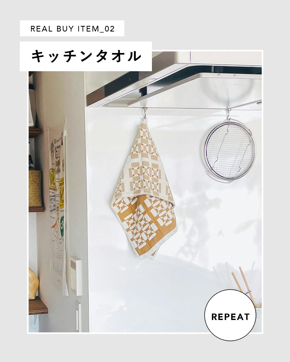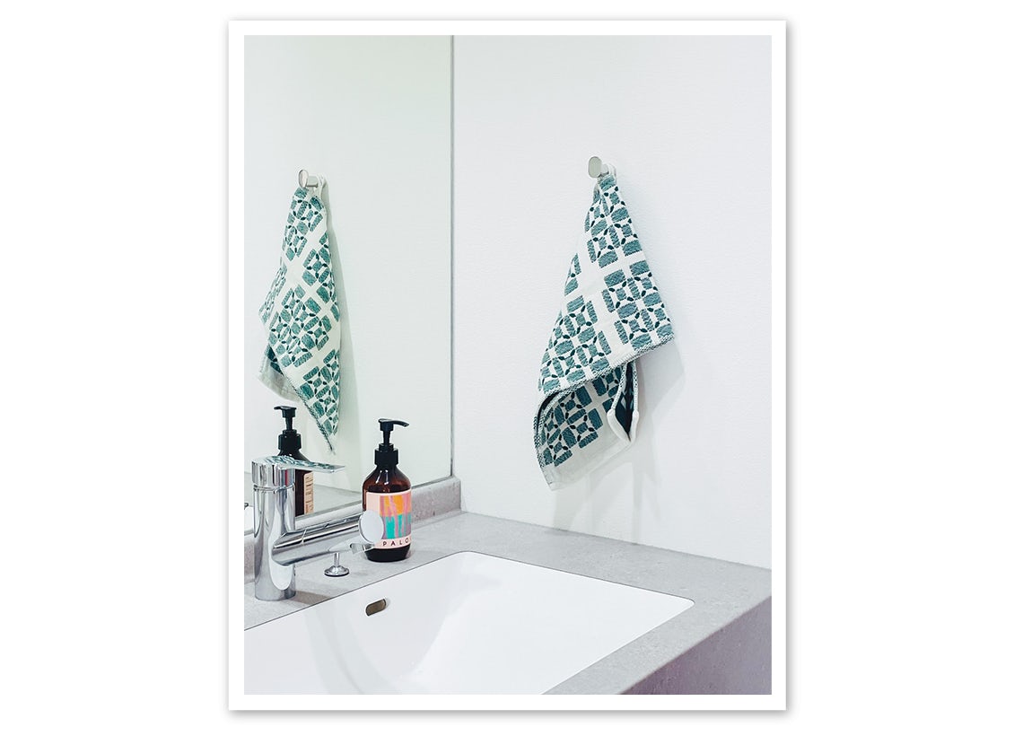 「当店オリジナルのジャガード織りのキッチンタオル。織柄に惹かれて購入したのですが、想像以上に使い心地がよくて! 厚みがしっかりあって、吸水性もばっちり。フックでも吊るせるし、コンパクトなサイズ感も気に入ってます。吊るしてある景色が可愛くて色違いで欲しくなり、リピート買いしました。キッチン、洗面スペースで活躍しています」