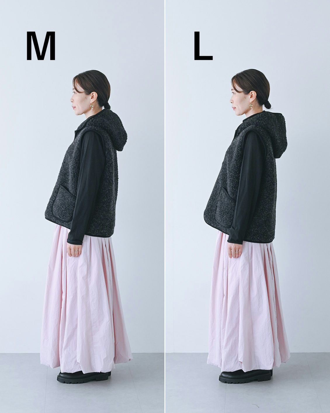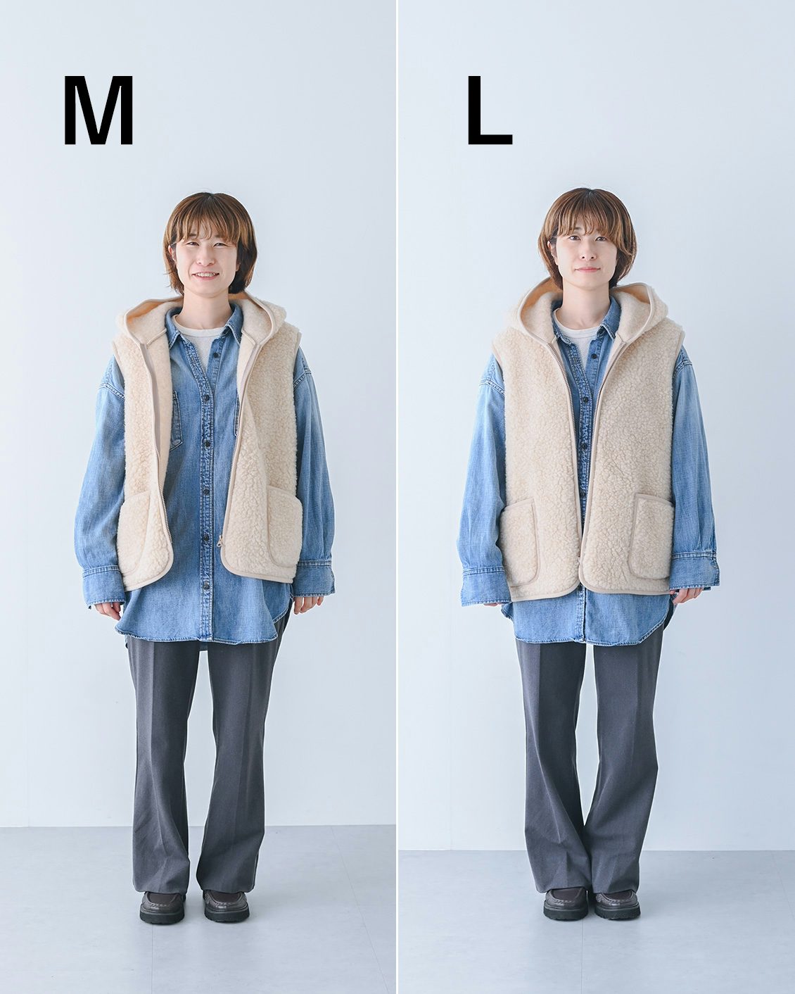 このベストは M・Lの2サイズ展開。推奨身長は以下の通りですが、いずれもゆったりサイズなのでお好みのシルエットで選んでいただいても。