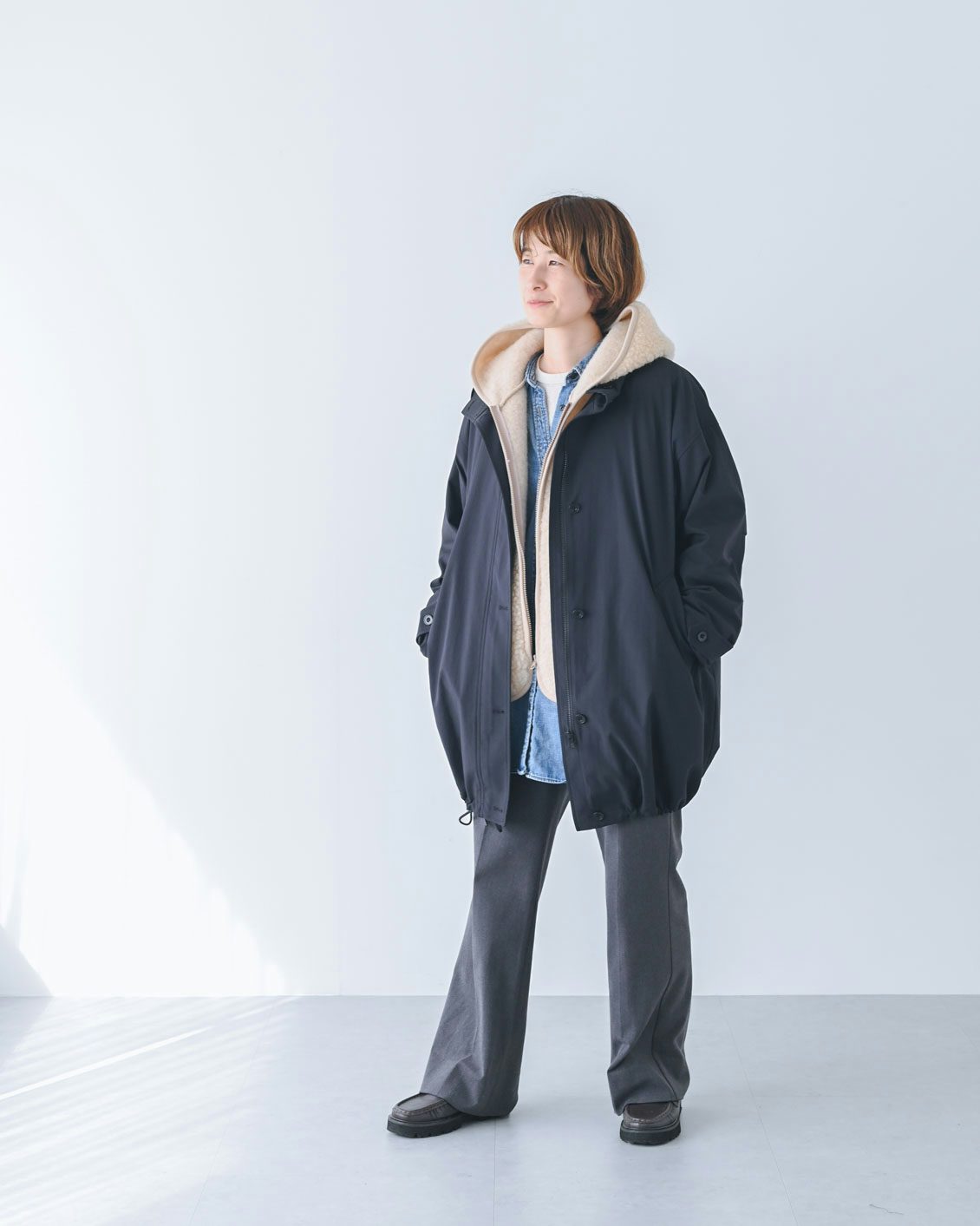 裾がすぼまるようなデザインじゃないから、どんな形のボトムスにも合いますね。前を閉めてもゆとりがあって、様々な着こなしが楽しめそうです」