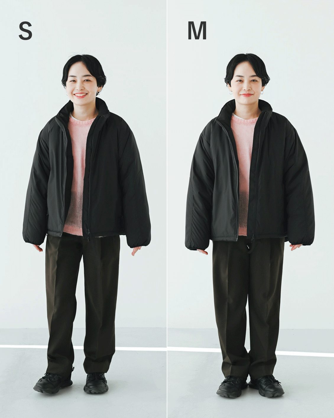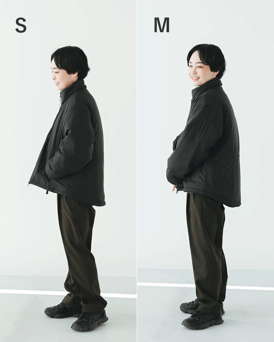 Mサイズも問題なく着用できて、全身が包み込まれるようなゆったり感があります。シルエットの好みで選んでいただくのが良さそうです」