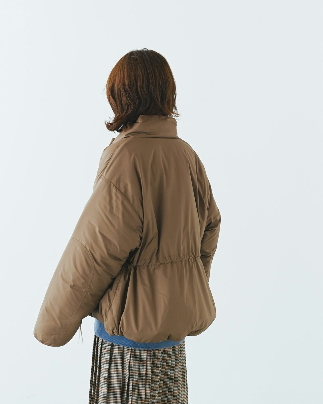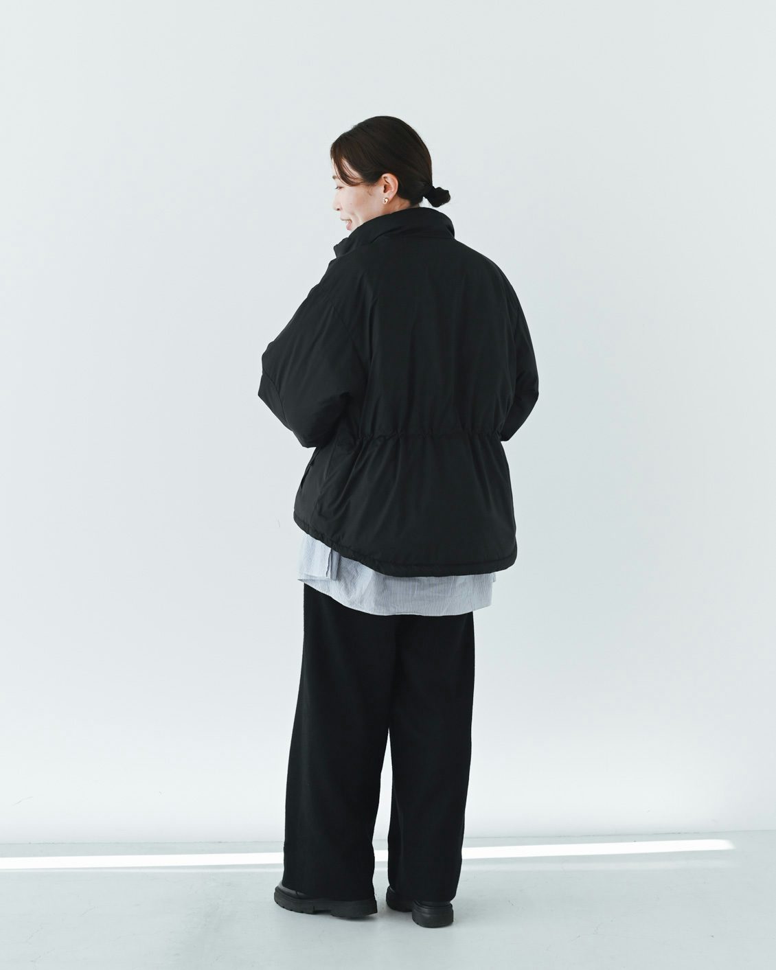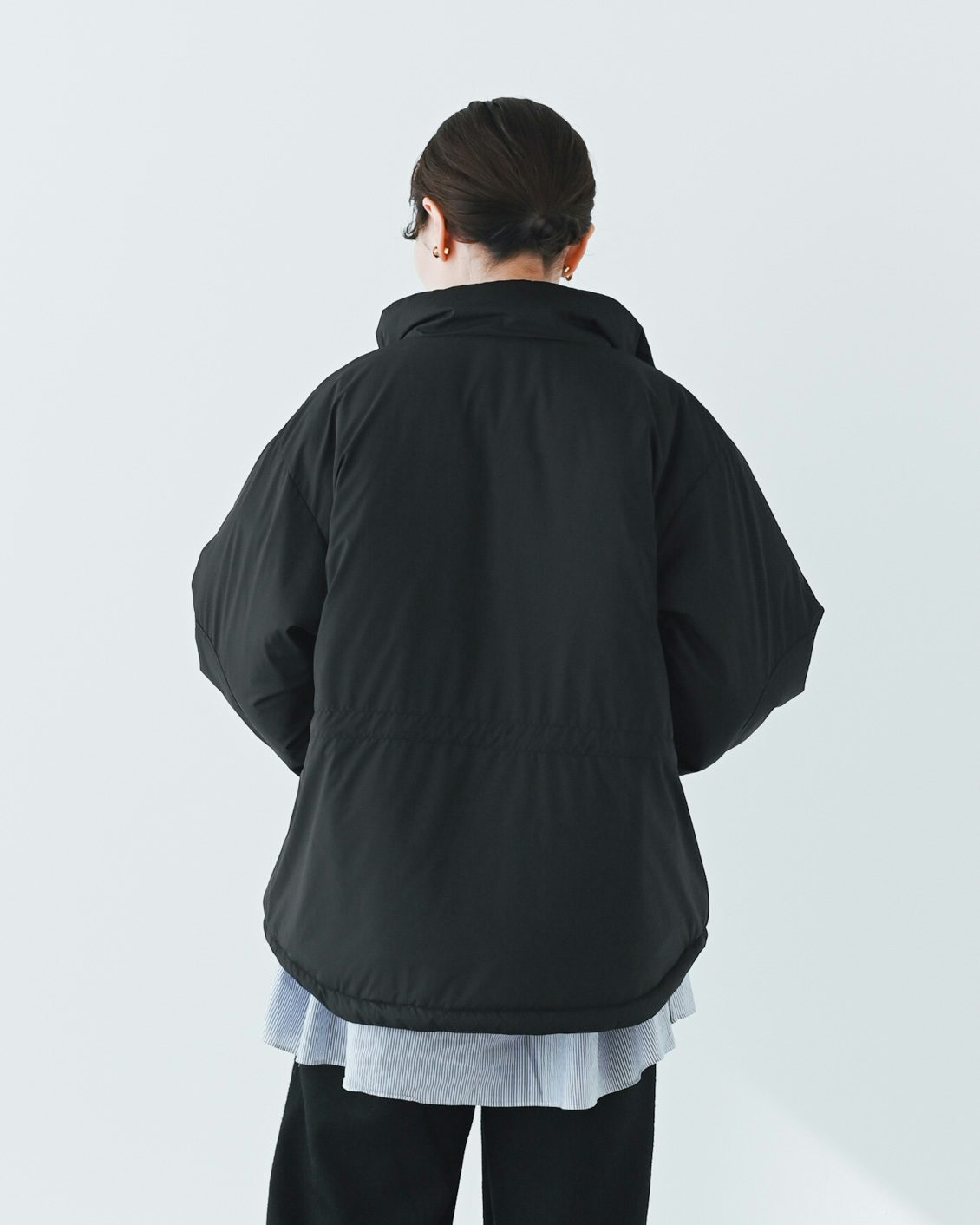 そのままで着るとAラインのシルエットで、「ウエスト位置」と「裾」の2箇所にドローコードが付いているので、膨らみを抑えてすっきり着られるアウターです。