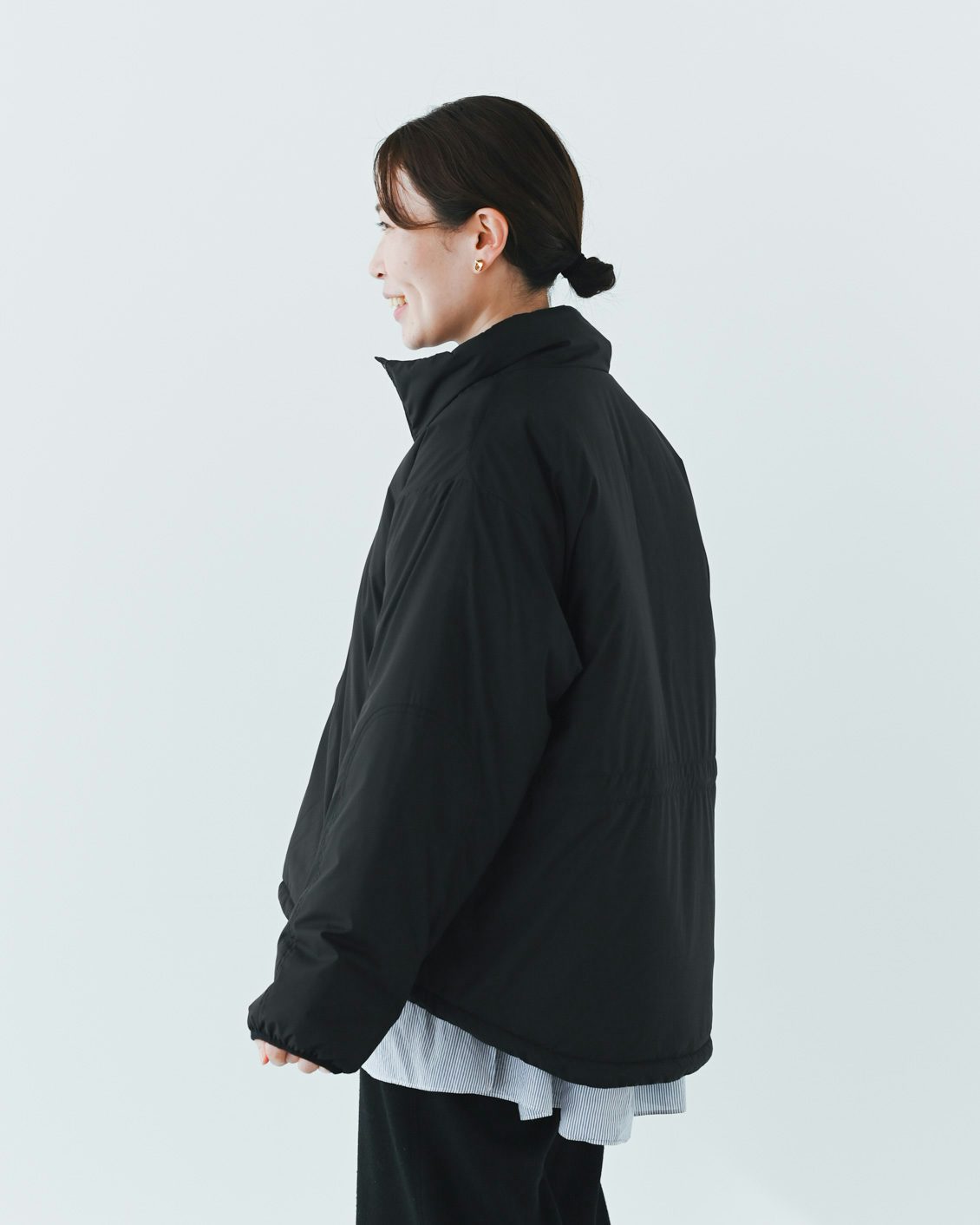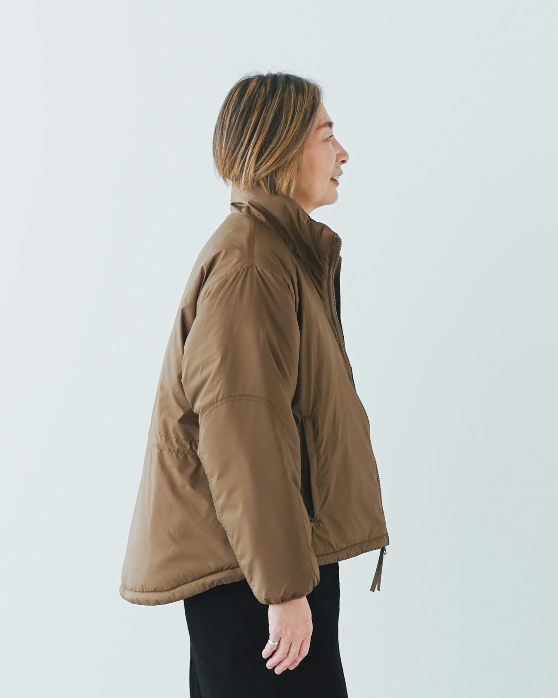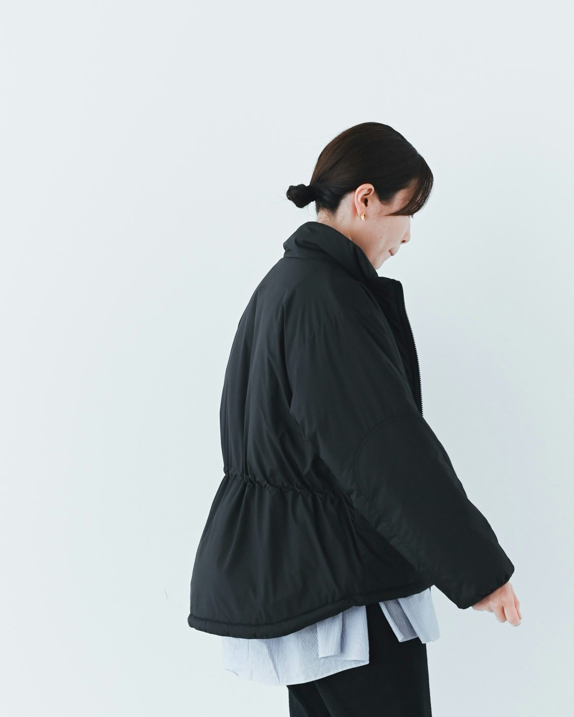 そのままで着るとAラインのシルエットで、「ウエスト位置」と「裾」の2箇所にドローコードが付いているので、膨らみを抑えてすっきり着られるアウターです。