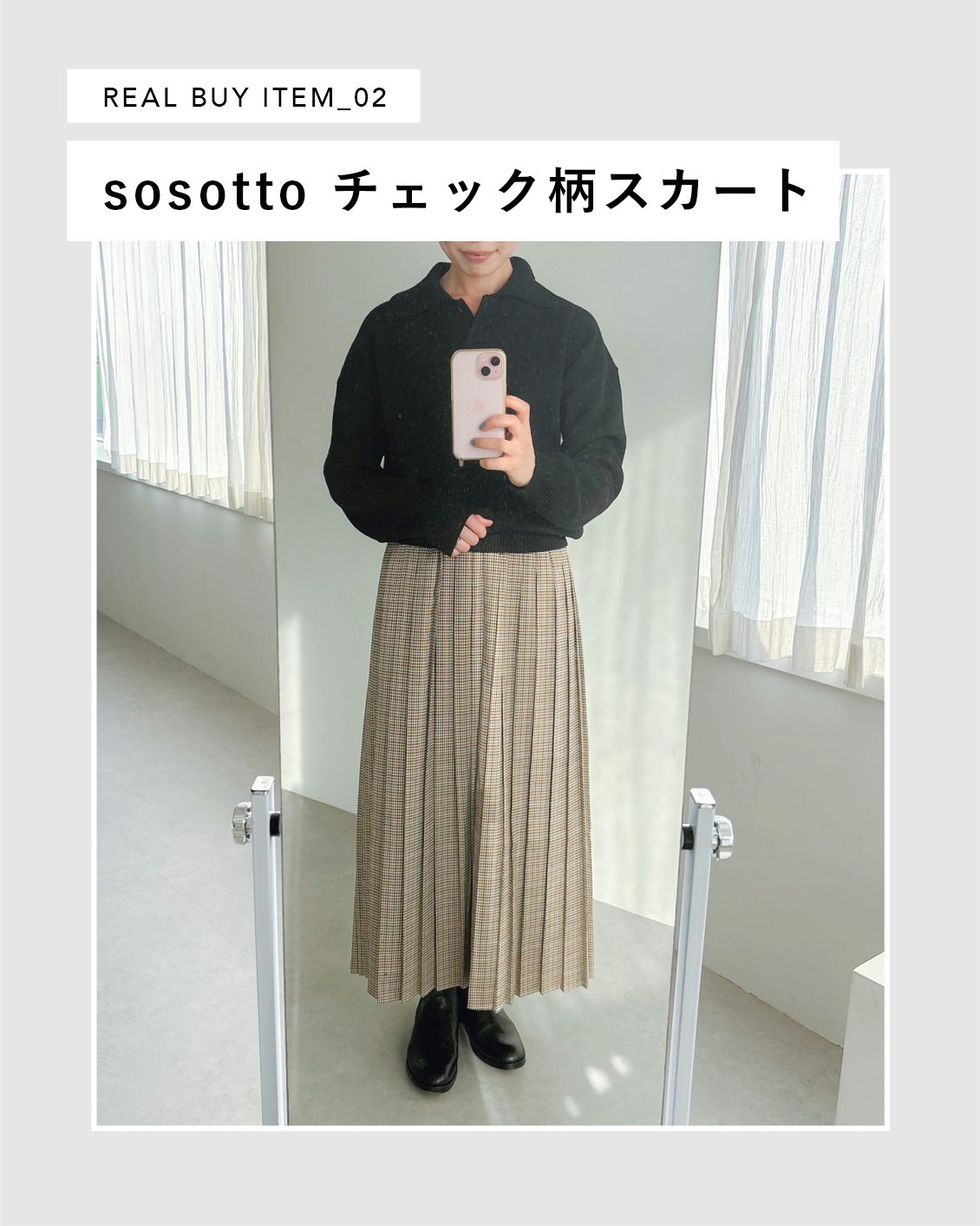 「sosottoのこちらのプリーツスカートは、着用レビューで試着した昨年からずっと欲しいなと思っていて、同じチームのスタッフにも似合う!と背中を押されたこともあり、再入荷のタイミングでとうとう購入しました。