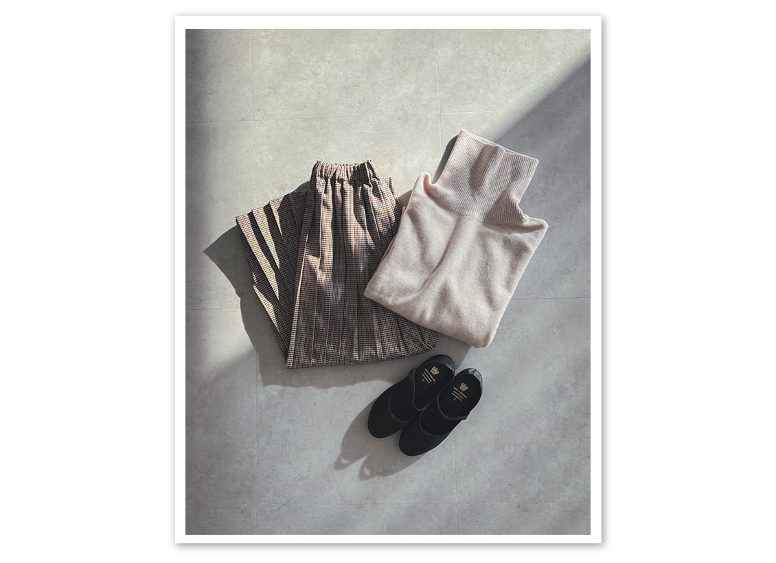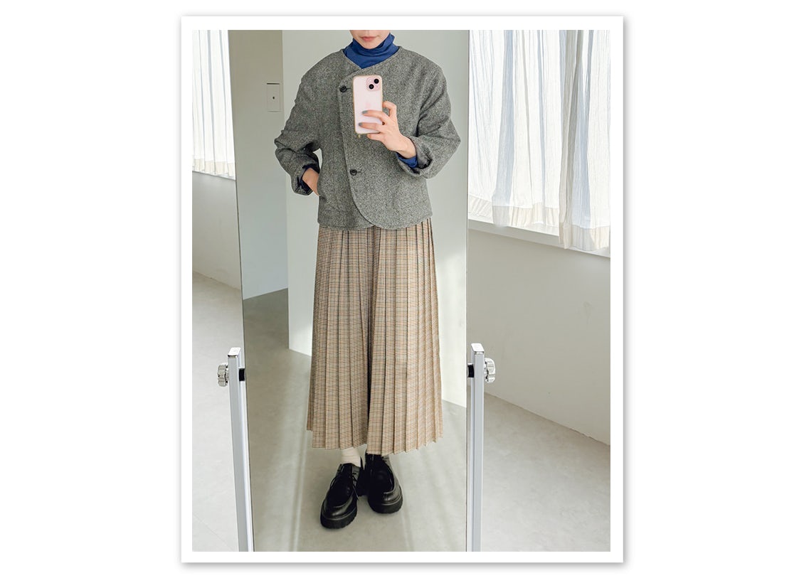 カラーは、暗くなりがちな冬のコーデをパッと明るくしてくれるブラウン。黒やベージュなど、シンプルなニットと組み合わせが好きで、外出したときもコートからちらっとみえるのが可愛いんです。シワもできにくいし、足捌きもよく、日常的にガシガシ着たいと思ってます」