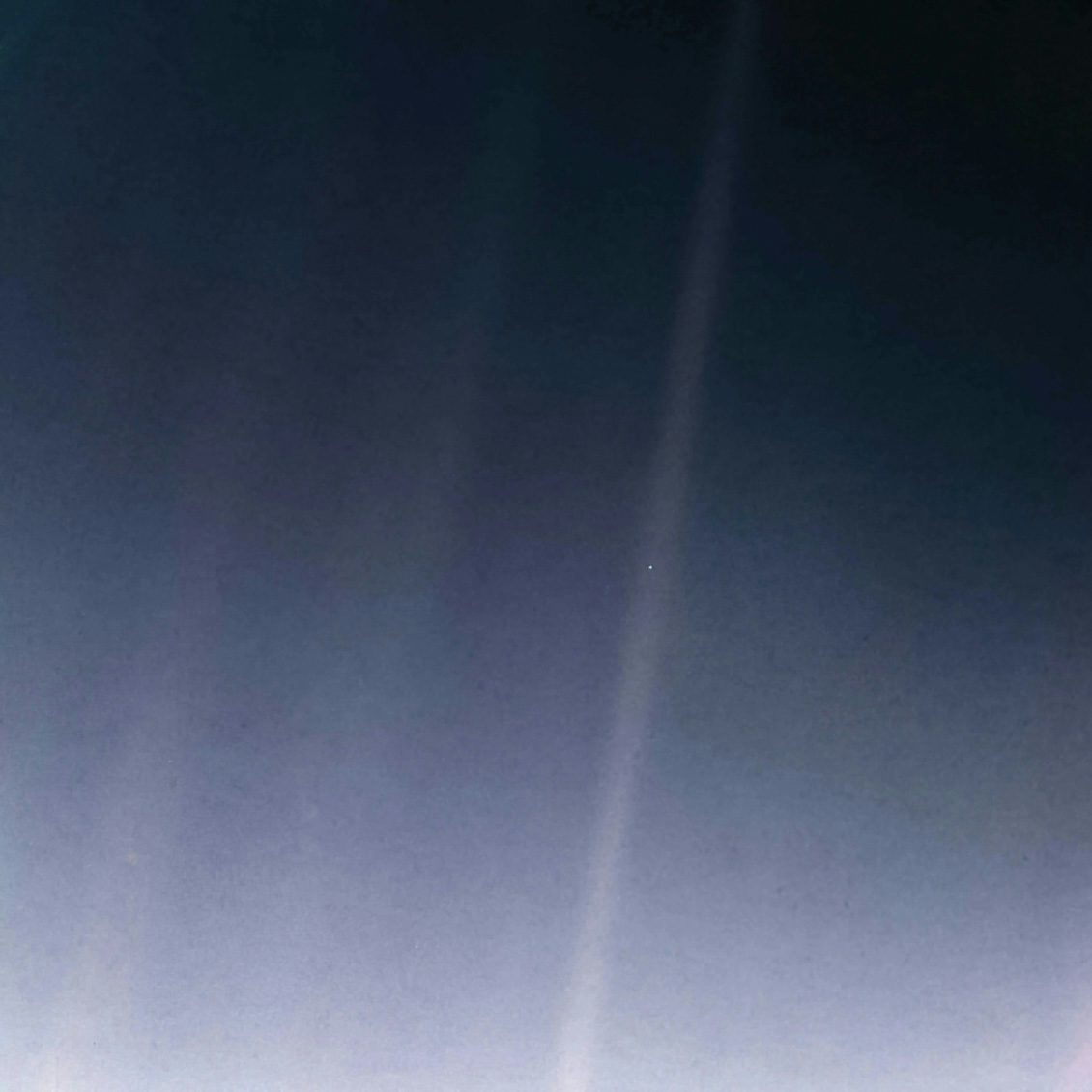 1990年、海王星の探査を終えたあと、約60億キロメートルのかなたから撮られた、地球の姿です。漆黒の闇のなかで、針のさきほどの点が、淡く青く光っています。