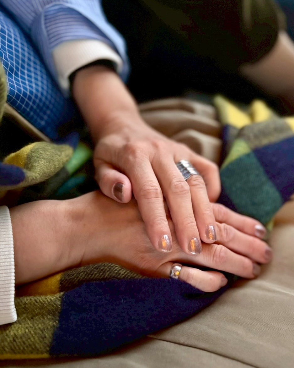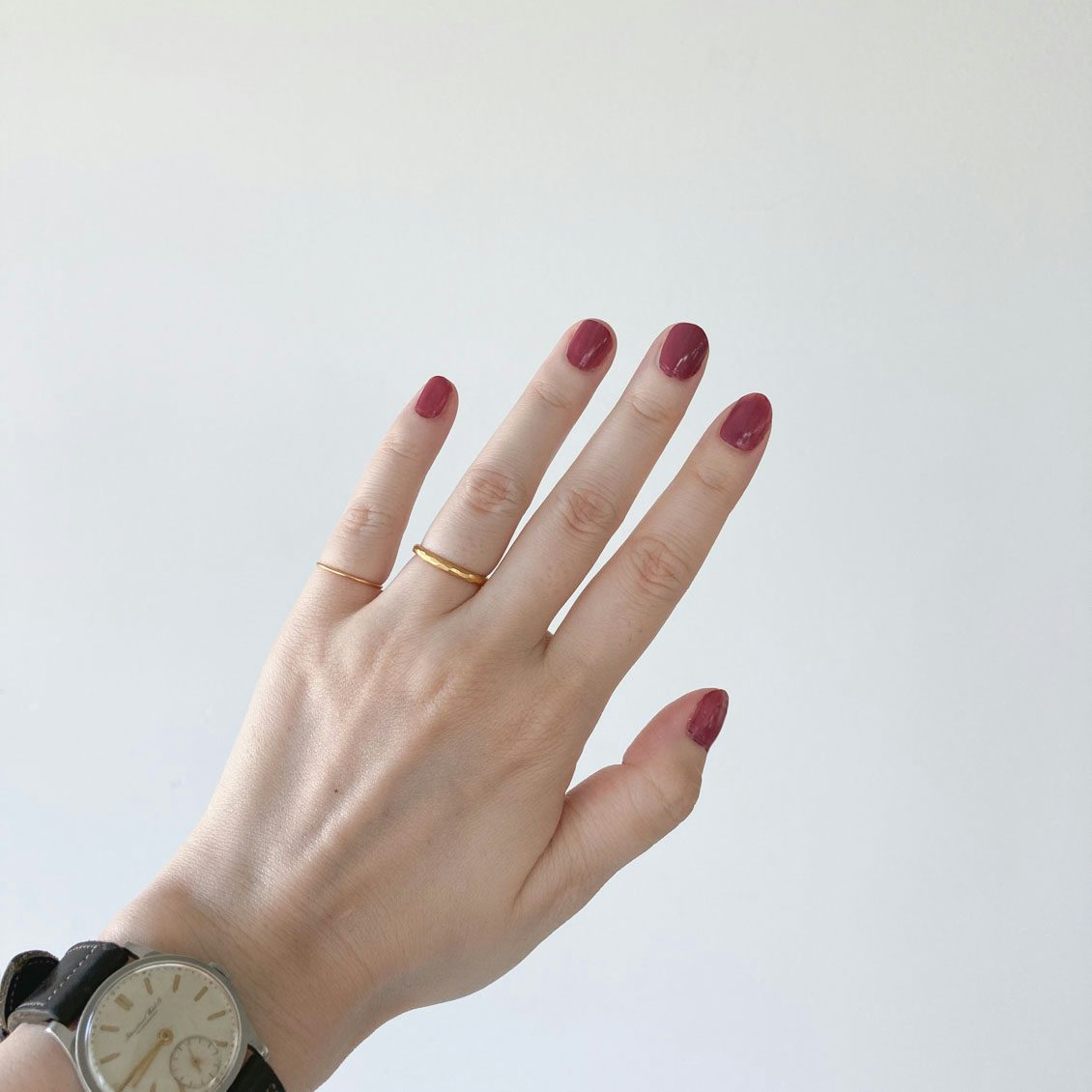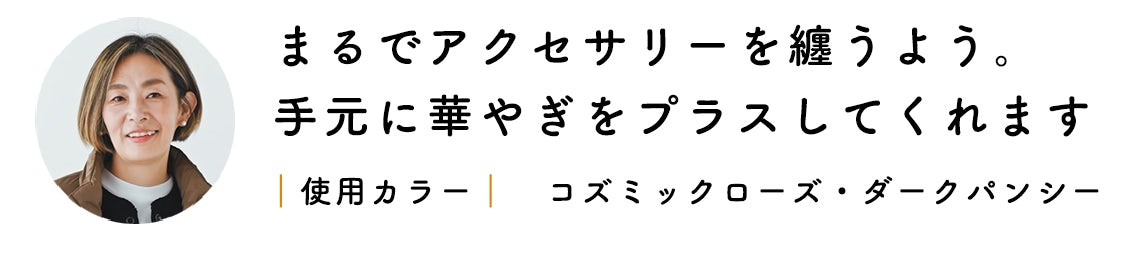 「もう1色のダークパンシーは、深みのある赤だけど透け感があるから重く感じず、まるで真紅のバラの花びらのよう。つけてみると強烈な印象はなく、どんな色の服とも相性が良くて、大人びた指先がただただ嬉しく感じました。