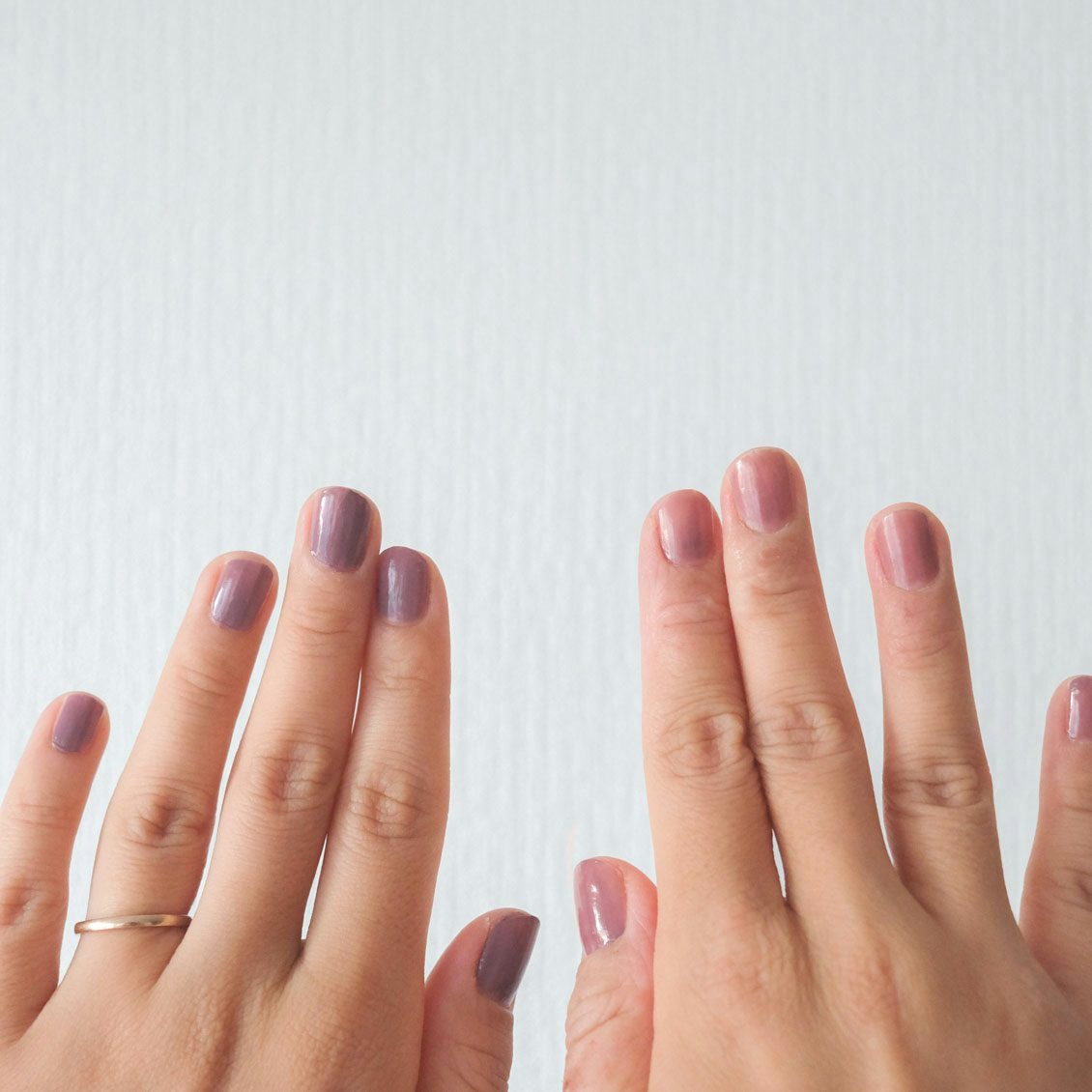私の場合は、一度塗りの透明感をのこした感じの色も好きですし、二度塗りしてグレー感が増すのもシックでいいなと思いました。服は黒が多いので、指先にこの色があると大人っぽくまとめてくれそうです」