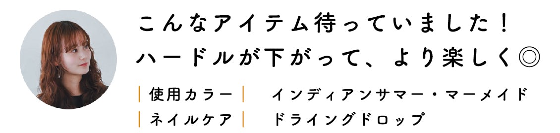 ドライングドロップを1滴垂らせば、ネイルがしっかりと乾いた状態になってくれて! 待ち時間が少なくなったことで、ハードルが一気に下がり、今まで以上にネイルカラーを楽しめるようになりそうです◎」