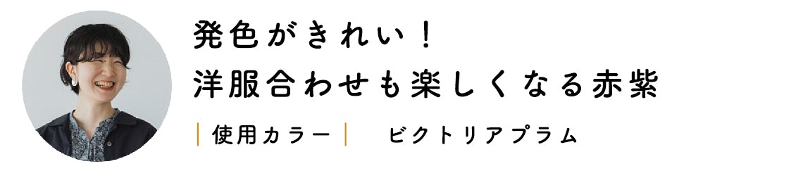 「私が試したのは、ビクトリアプラムという赤紫系の色。すこしブラウンが混ざっているのか、照明や見る角度によっては落ちついた印象に発色して、肌なじみのよいカラーだと思いました。