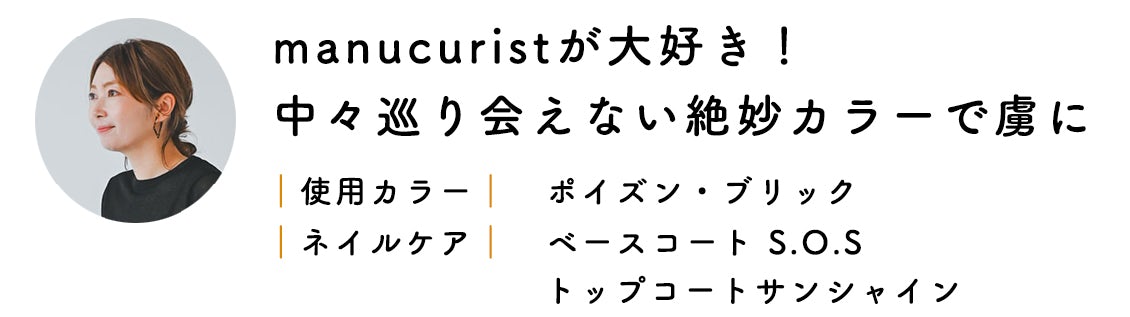 「manucuristのネイルアイテムは大好きで、以前から少しずつ集めています。ベージュなどの定番色も落ち着いてよく使っていますが、他にはない絶妙なカラーのラインナップがあるのがこのブランドの魅力。