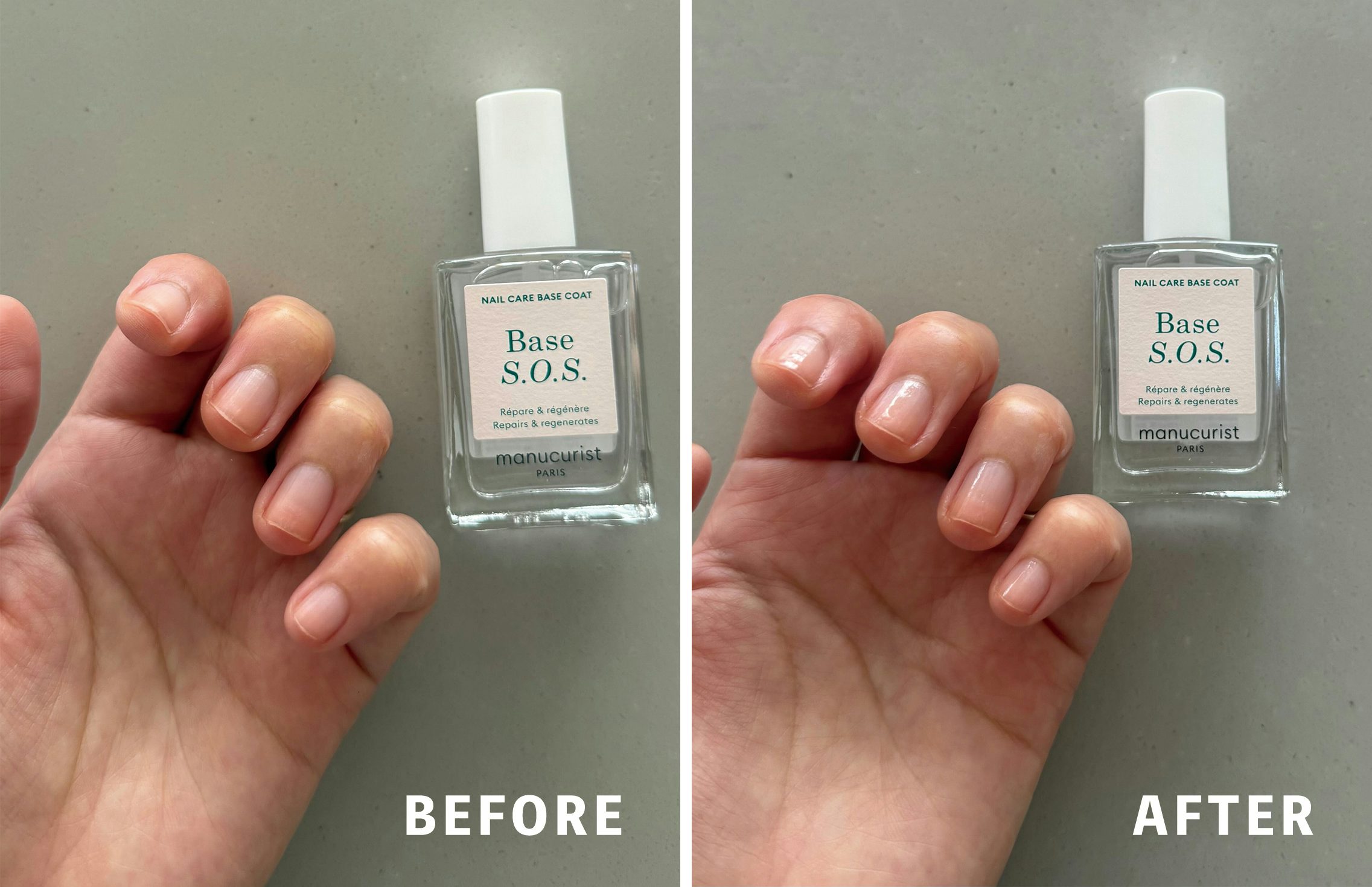 爪の縦線が気になり始め、ケアもしっかりしたいのでネイルカラーの前には『ベースコート S.O.S』を塗っています。これを塗ると、爪が割れにくく、表面の凹凸をフラットに整えてくれているので、ネイルの色が綺麗にのりやすくなりましたよ。