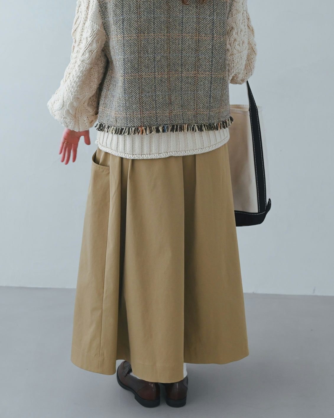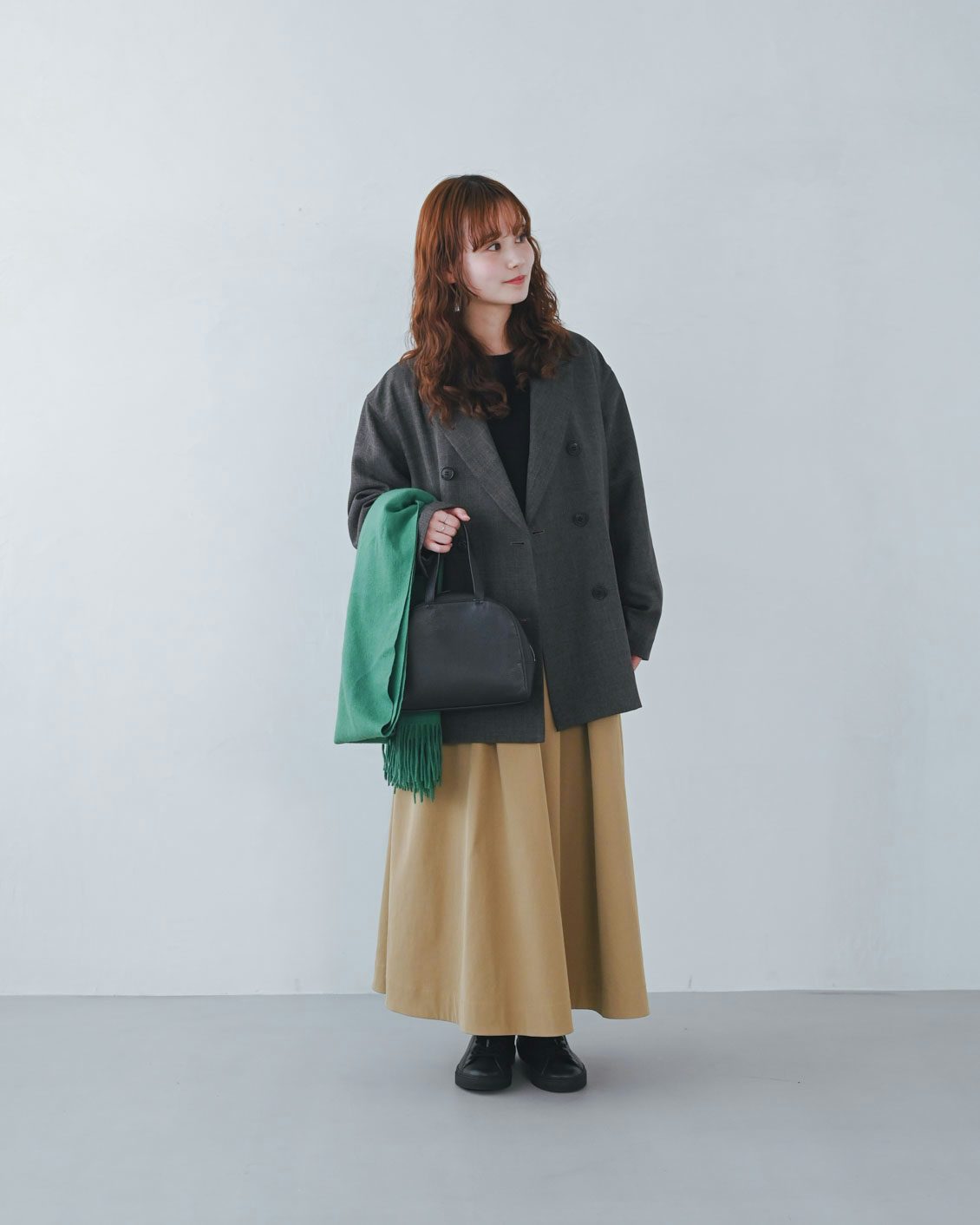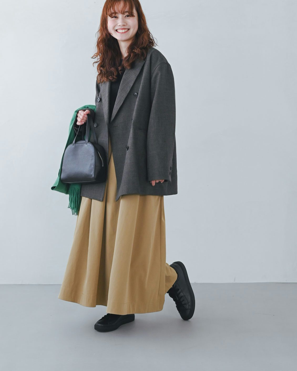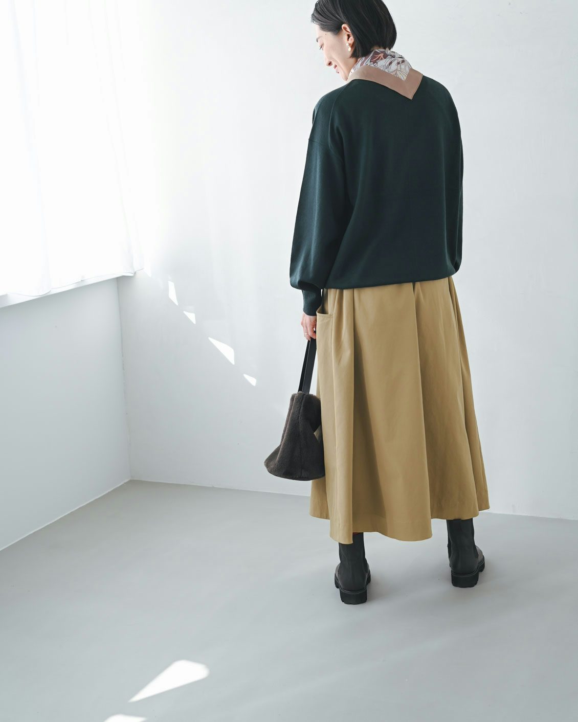 トップスはアウトで着ていて、足元もフラットなローファーですが、スカートがすっきり見せてくれるので全身のバランスがとりやすいです」