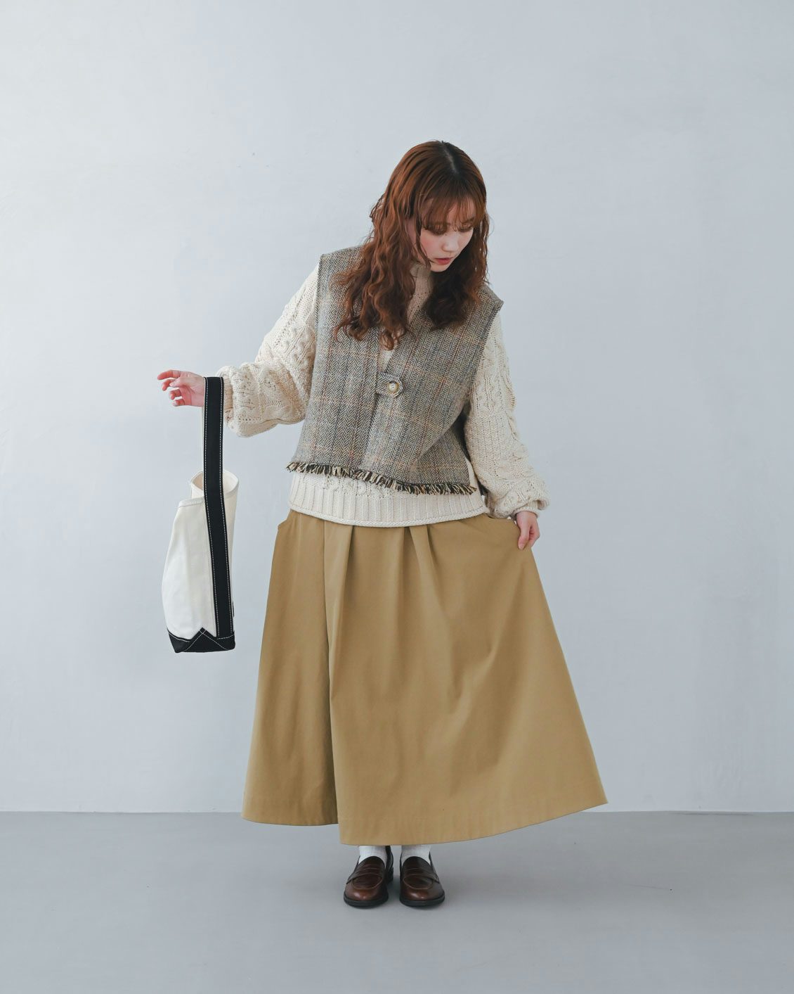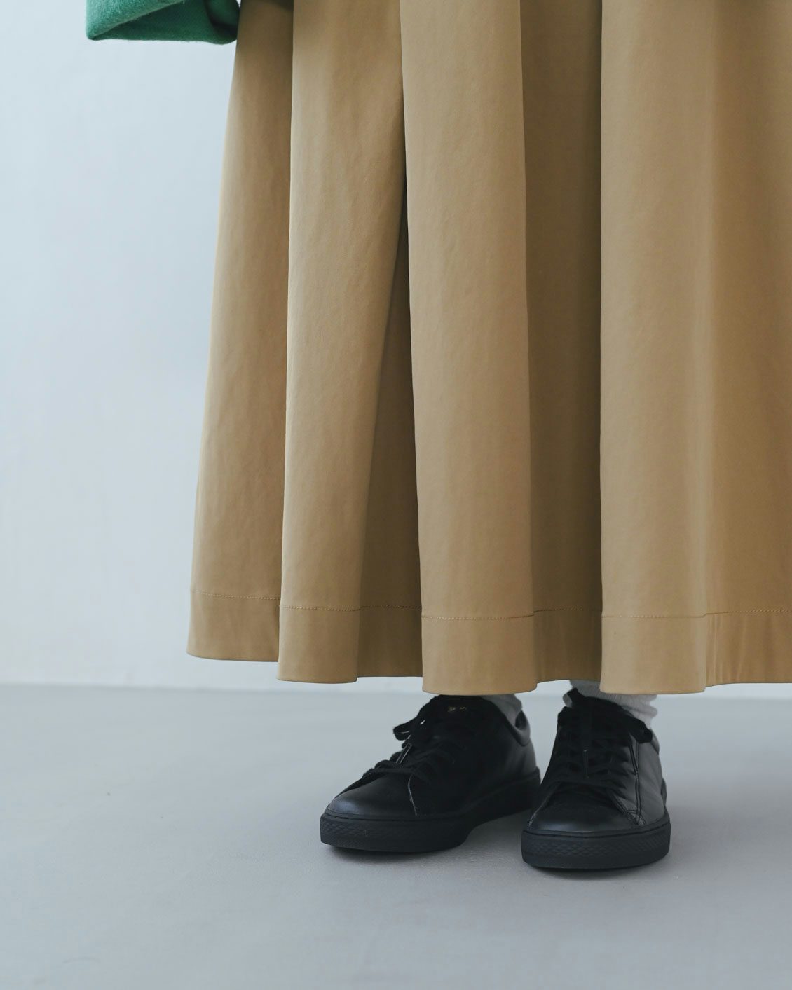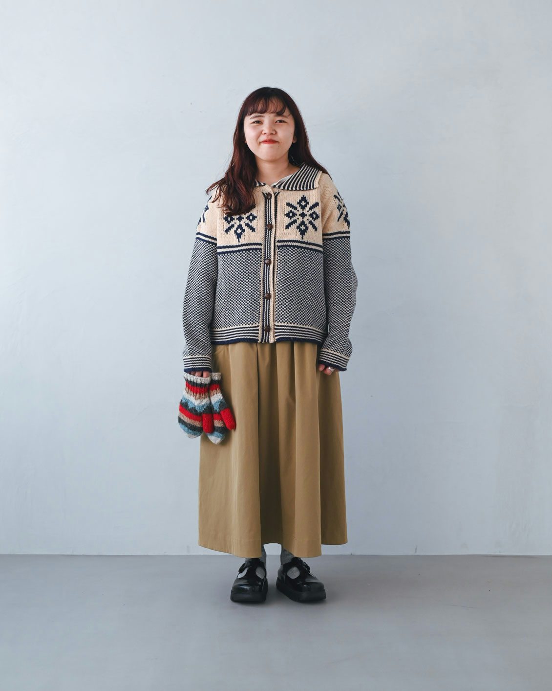 トップスはアウトで着ていて、足元もフラットなローファーですが、スカートがすっきり見せてくれるので全身のバランスがとりやすいです」