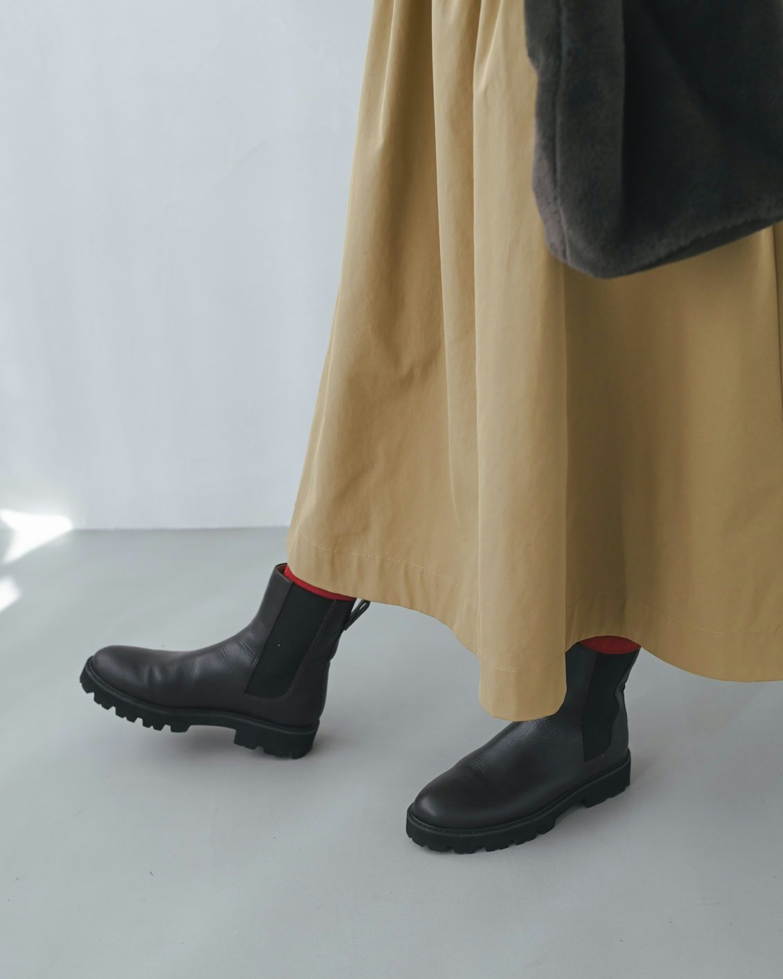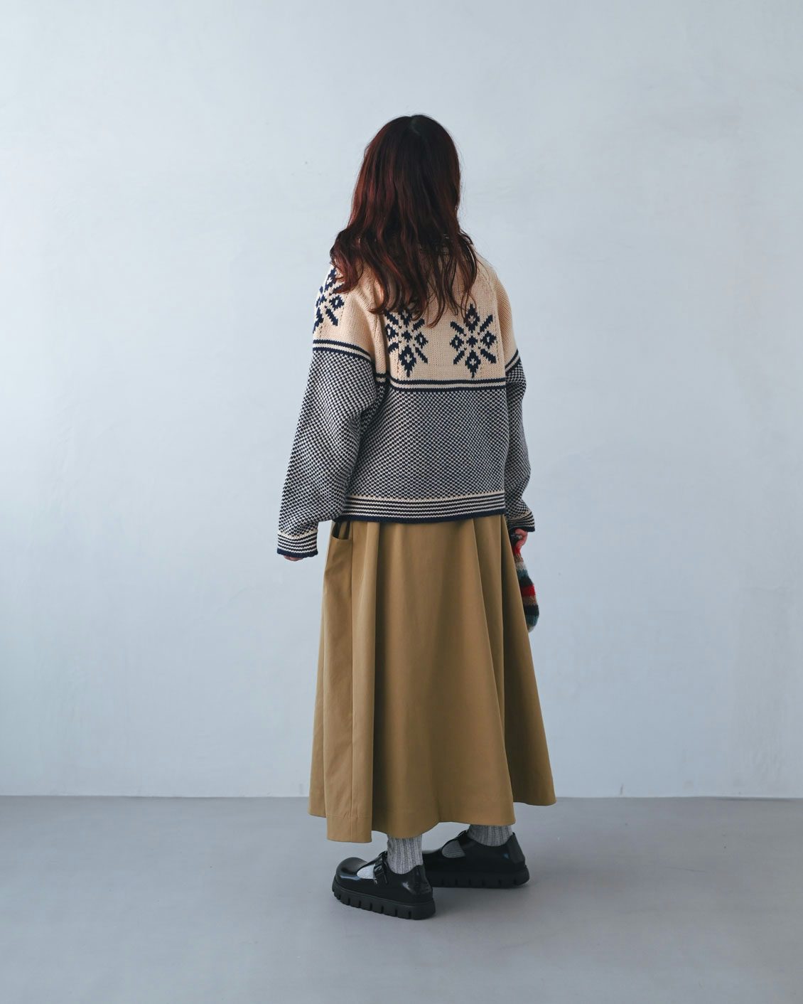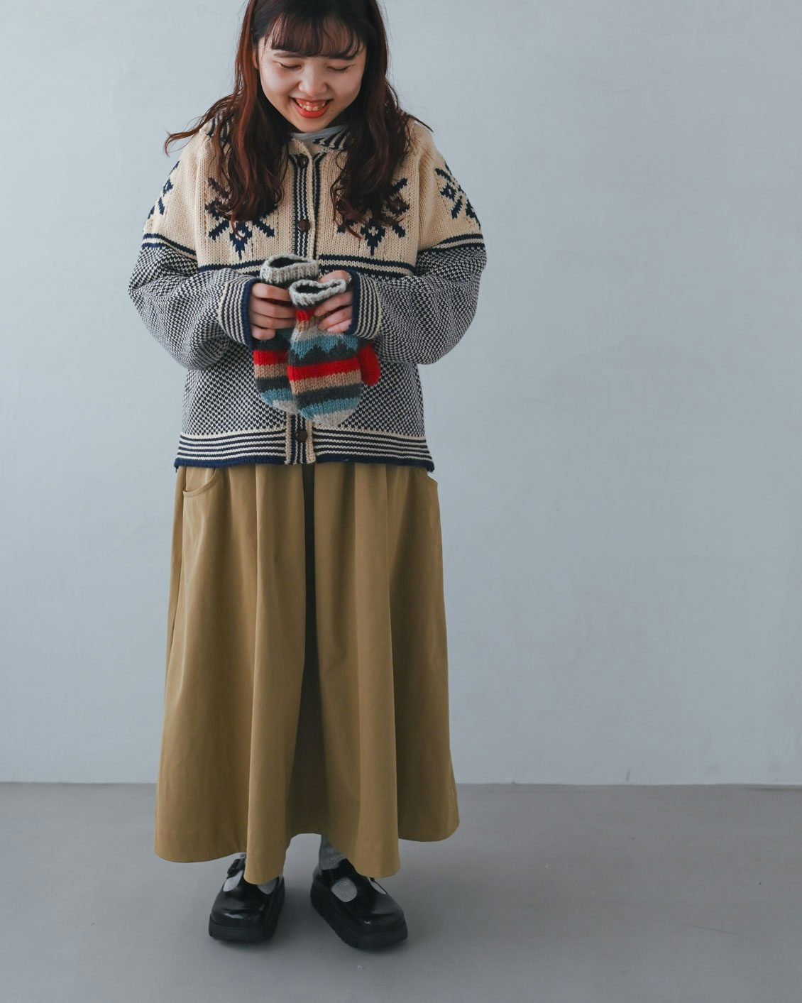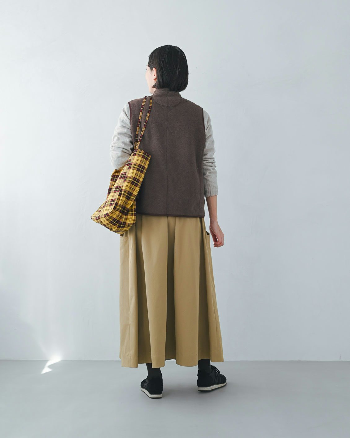 トップスはアウトで着ていて、足元もフラットなローファーですが、スカートがすっきり見せてくれるので全身のバランスがとりやすいです」