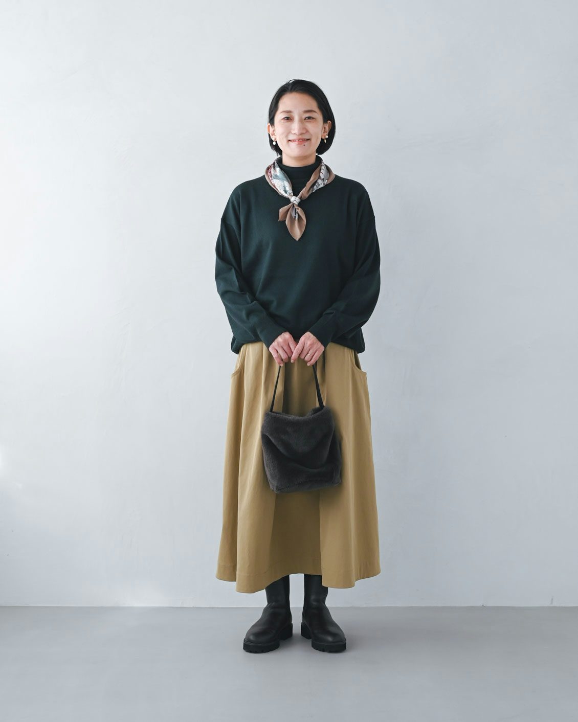 「ディープグリーンのニットやスカーフ、ブーツに合わせてみました。
