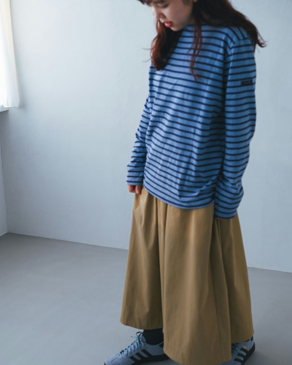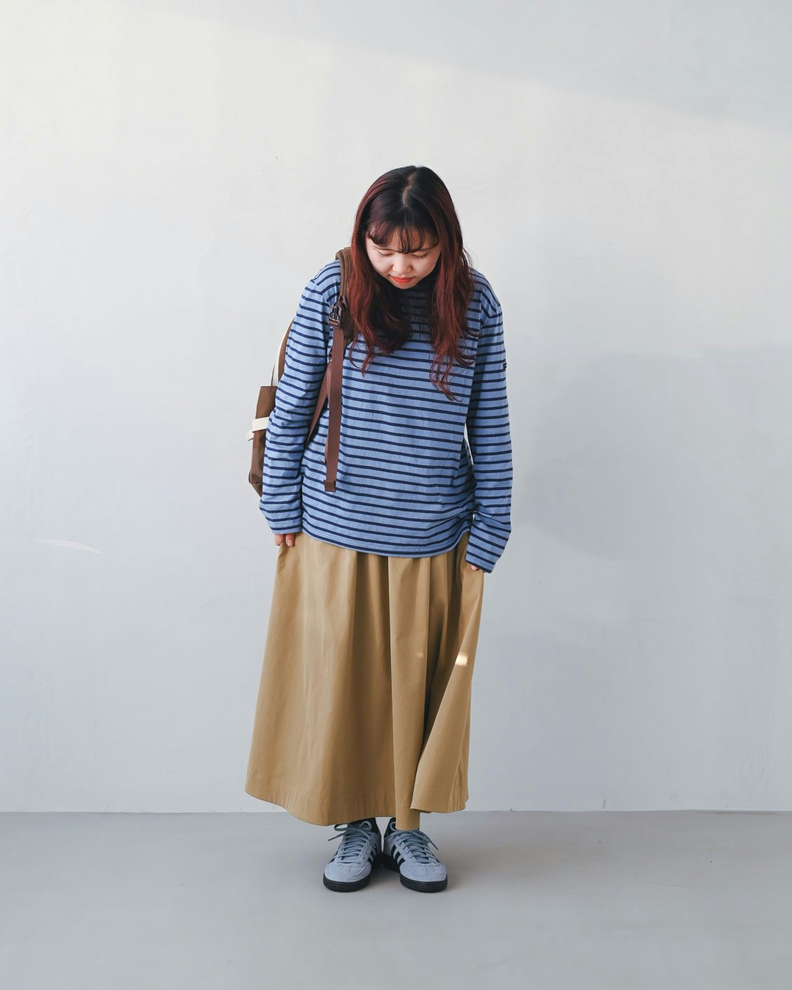 「ブルーのボーダーカットソーに合わせてみました。足さばきがよく、腰まわりも楽ちんなので、撮影で一日動きまわるときにも良さそうです!