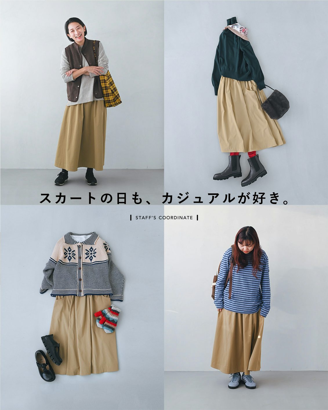 【カジュアルなスカート】チノパン感覚で、お出かけに。「ラテ」色のスカートと、スタッフ3名の着回し