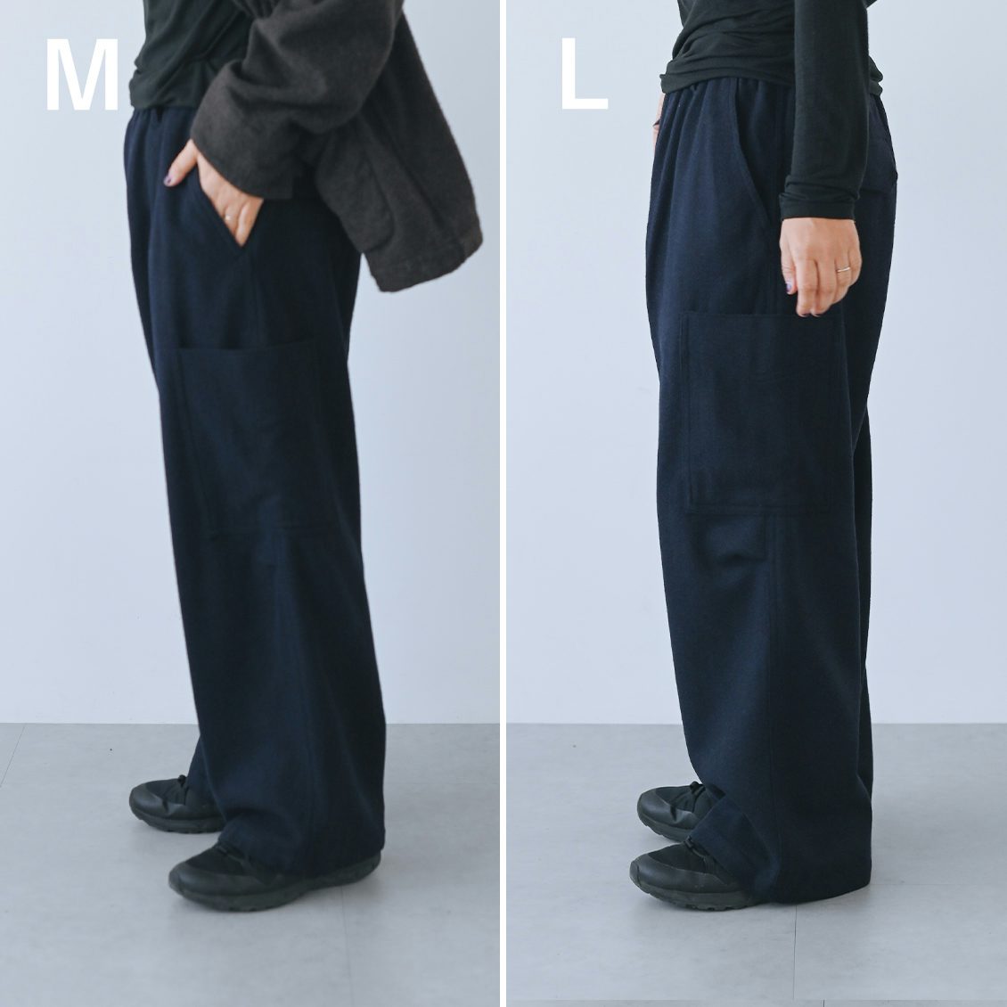 Lサイズ:選ぶならこちら。着丈はスニーカーのかかとにかかるくらい。裾を絞ると、地面に擦るということはなさそうです。ウエストやヒップは、Mサイズよりもややゆとりはありますが大きすぎるということはありません。普段からゆるっとリラックス感のある着こなしが好きなので、このボトムスはLサイズを選びたくなりました。丈が気になる方はMサイズがいいかもしれません。