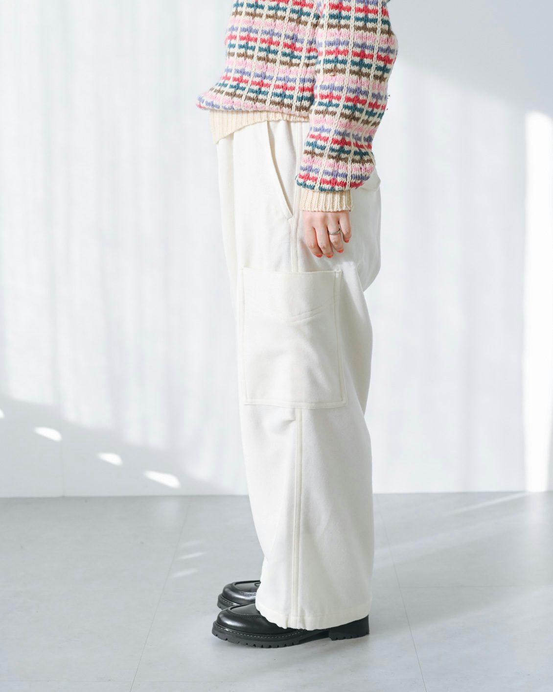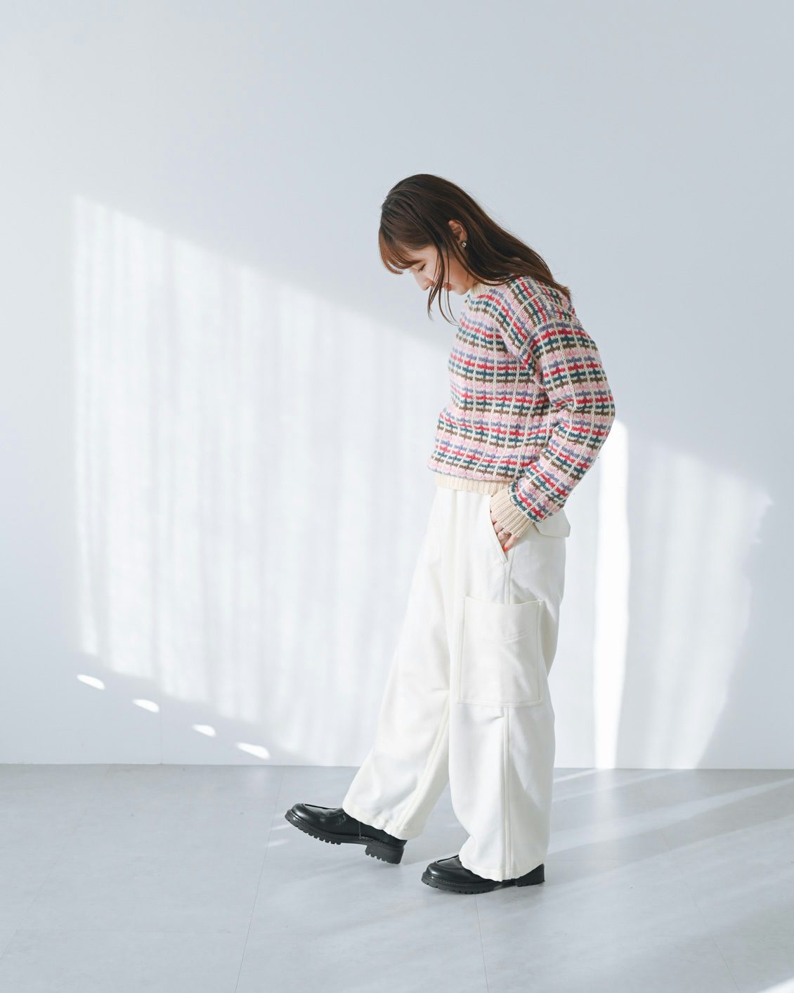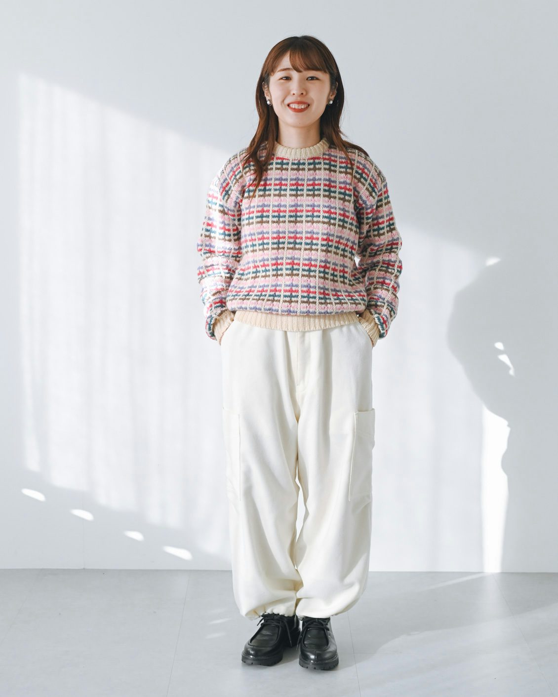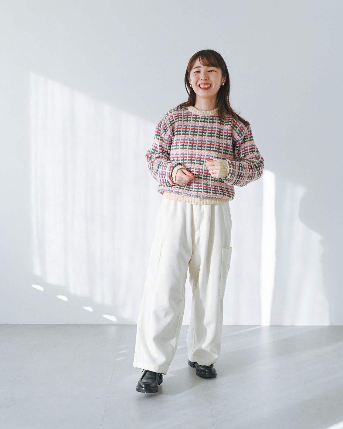 アイボリーの色味もいいですね。冬はアウターが暗くなりがちなので、明るい色のパンツをはきたくなるんです。これは真っ白じゃないので、いろんな洋服に馴染んでくれますし、カラフルなトップスとも相性ばつぐんでした」