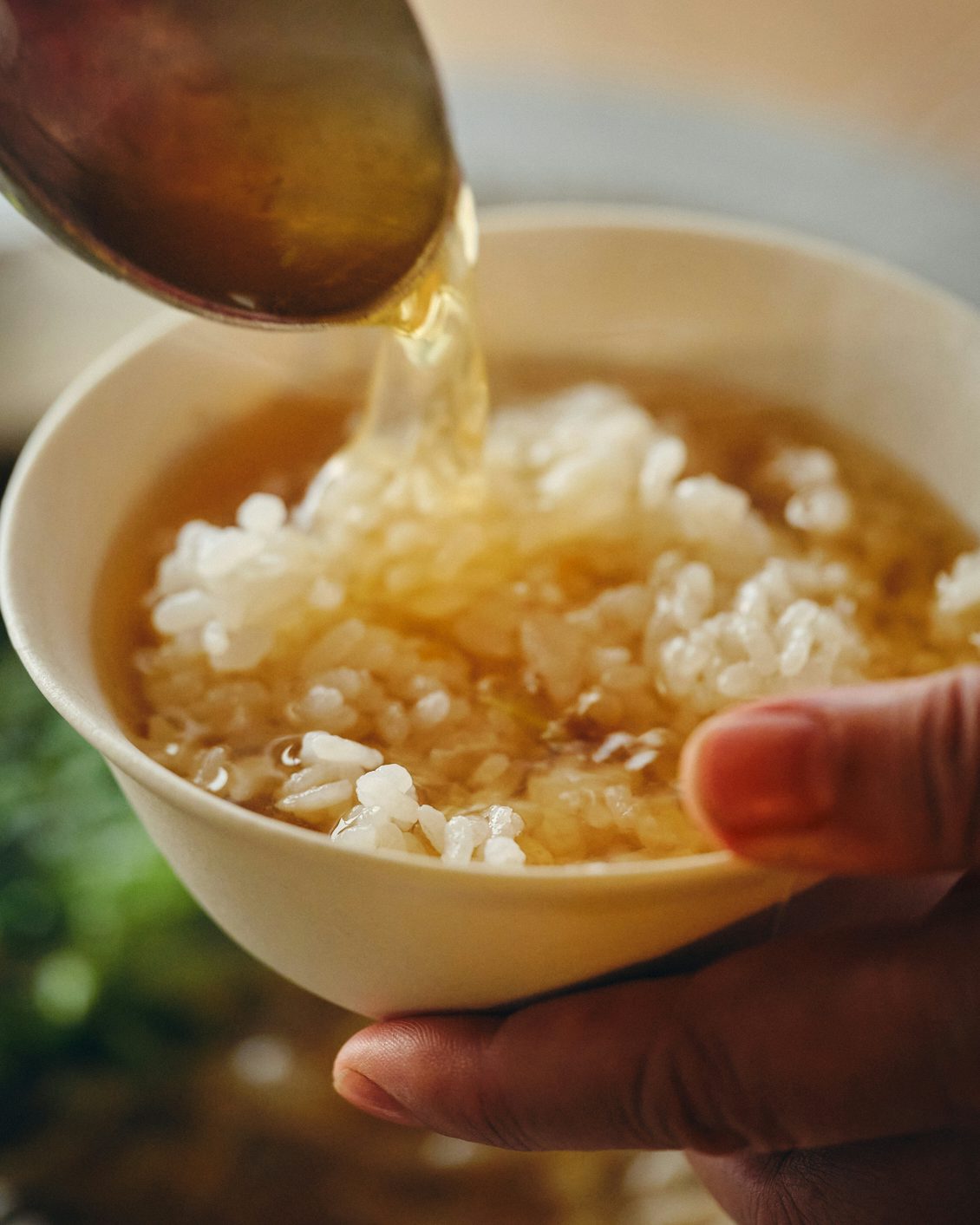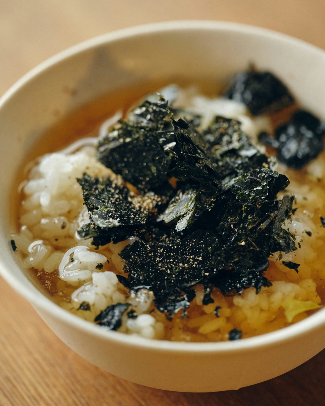 ごはんと汁とがランダムに混ざっているのが好きで、しめは雑炊よりも「汁かけごはん」派のしらいさん。海苔をちぎってかけ、黒こしょうで味を引き締めたら完成です。