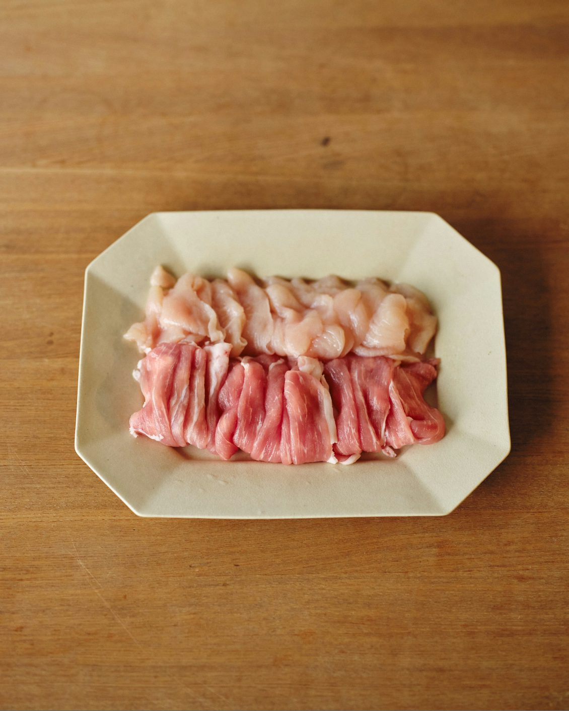 「お肉は脂が少なく高タンパクな、豚もも肉と鶏むね肉。たっぷりお肉を食べても罪悪感が少なく、2種類入れることで単調にならないのがポイント。これはアスリートの鍋です!(笑)