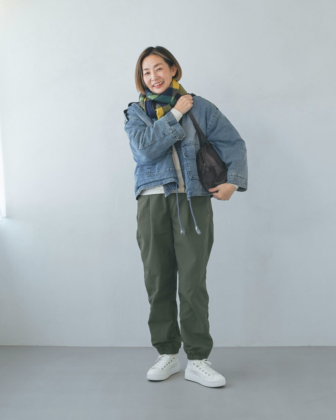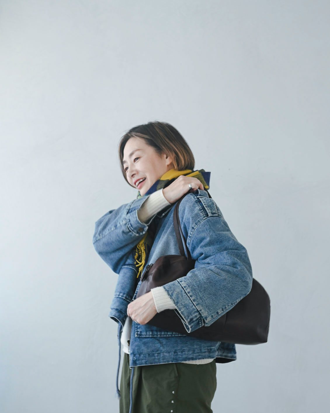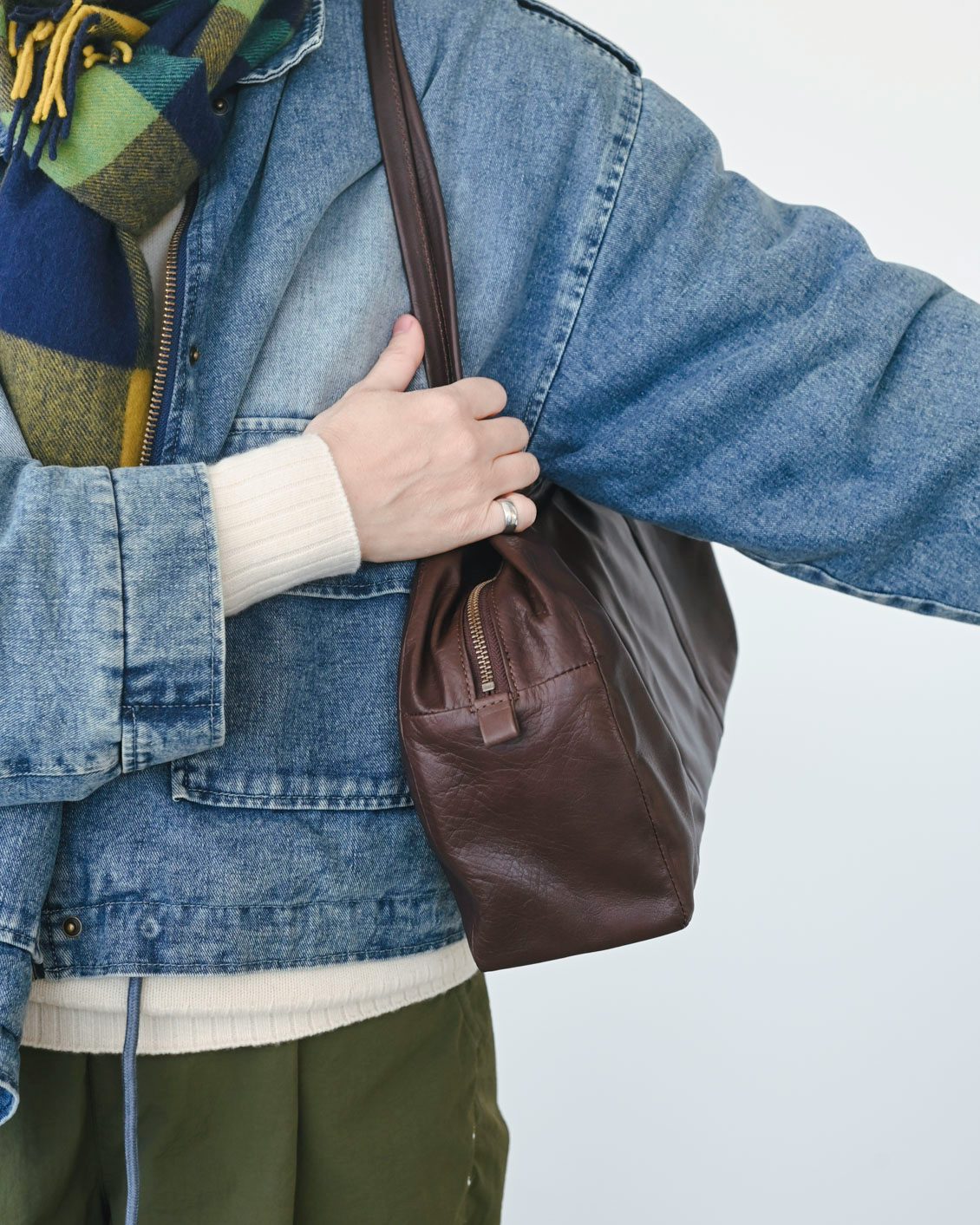 「今回着ているのは、もこもこの裏地がついたデニムジャケットで、中に厚着もしているんですが、肩にバッグをかけても窮屈な感じがないのがいいですね。