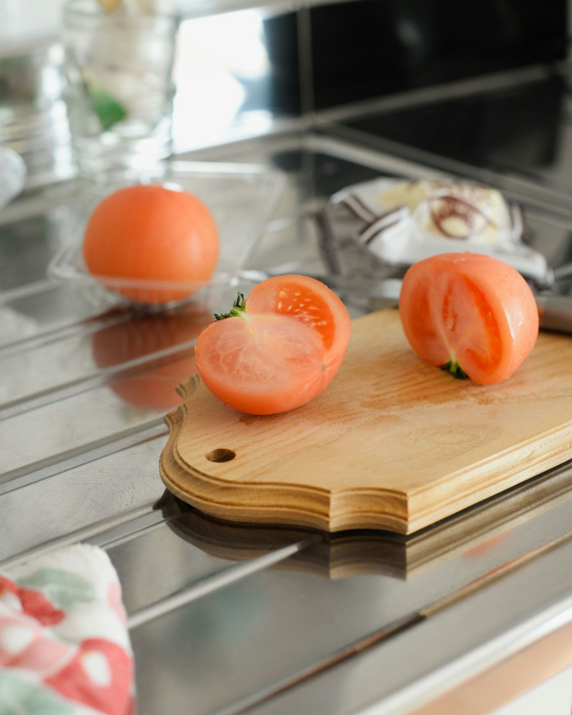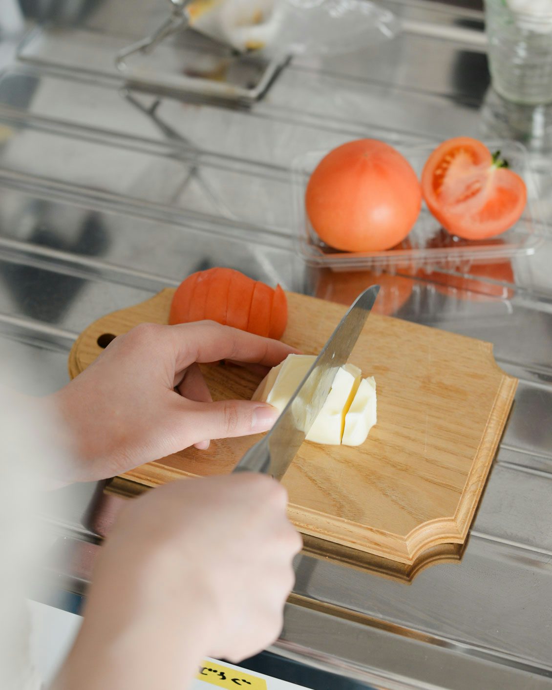 チーズもトマトもカッティングボードの上でカットして、並べたらもう完成。これ一つでまな板とお皿の二役をこなしてくれるのが便利です。