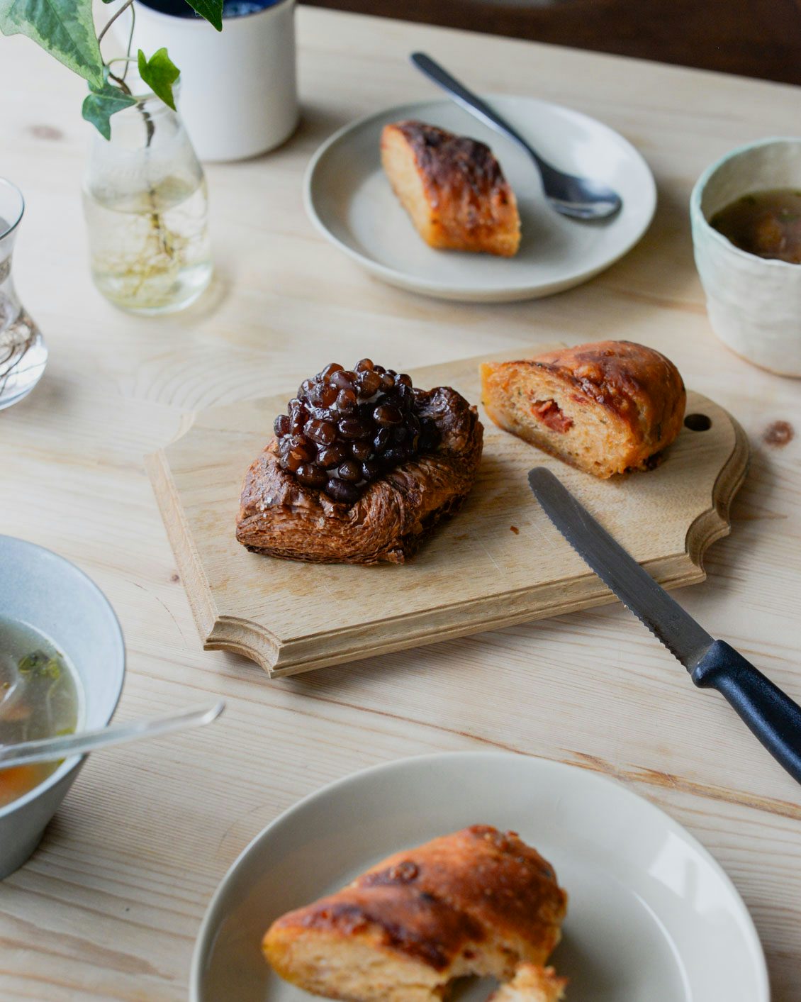 カッティングボードを食卓の真ん中に置いてパンをのせると、それだけでテーブルの上がかわいい景色になりました。