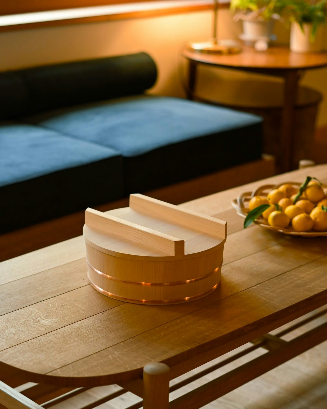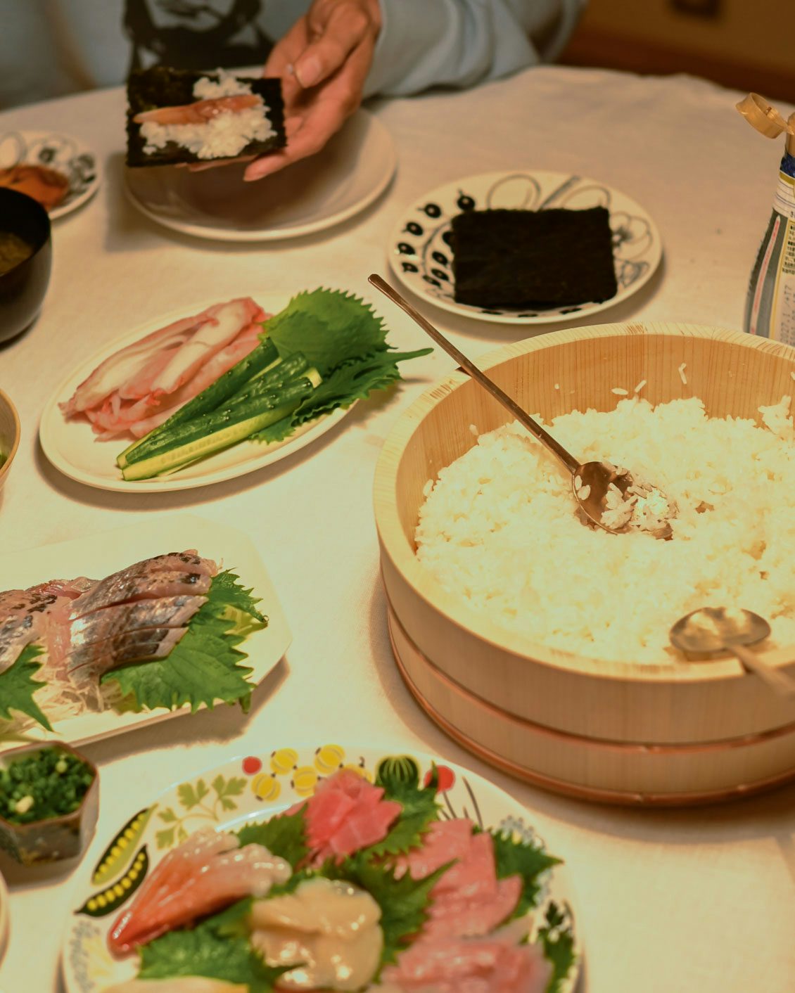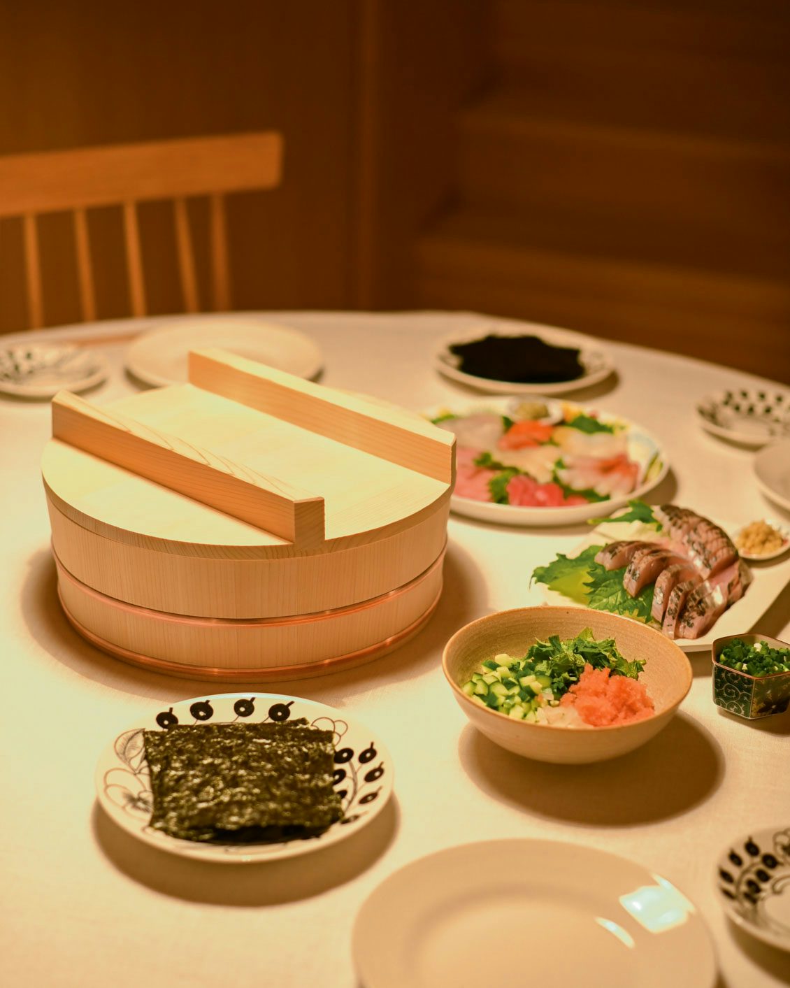 先に仕込んでおいた酢飯が入った飯台を円卓に置いてみたら、見たことのない光景にわくわく。照明の明るさも相まって、飯台が輝いてますね。なんのイベントもない土曜日なのに、飯台が置いてあるだけで特別な感じがします。