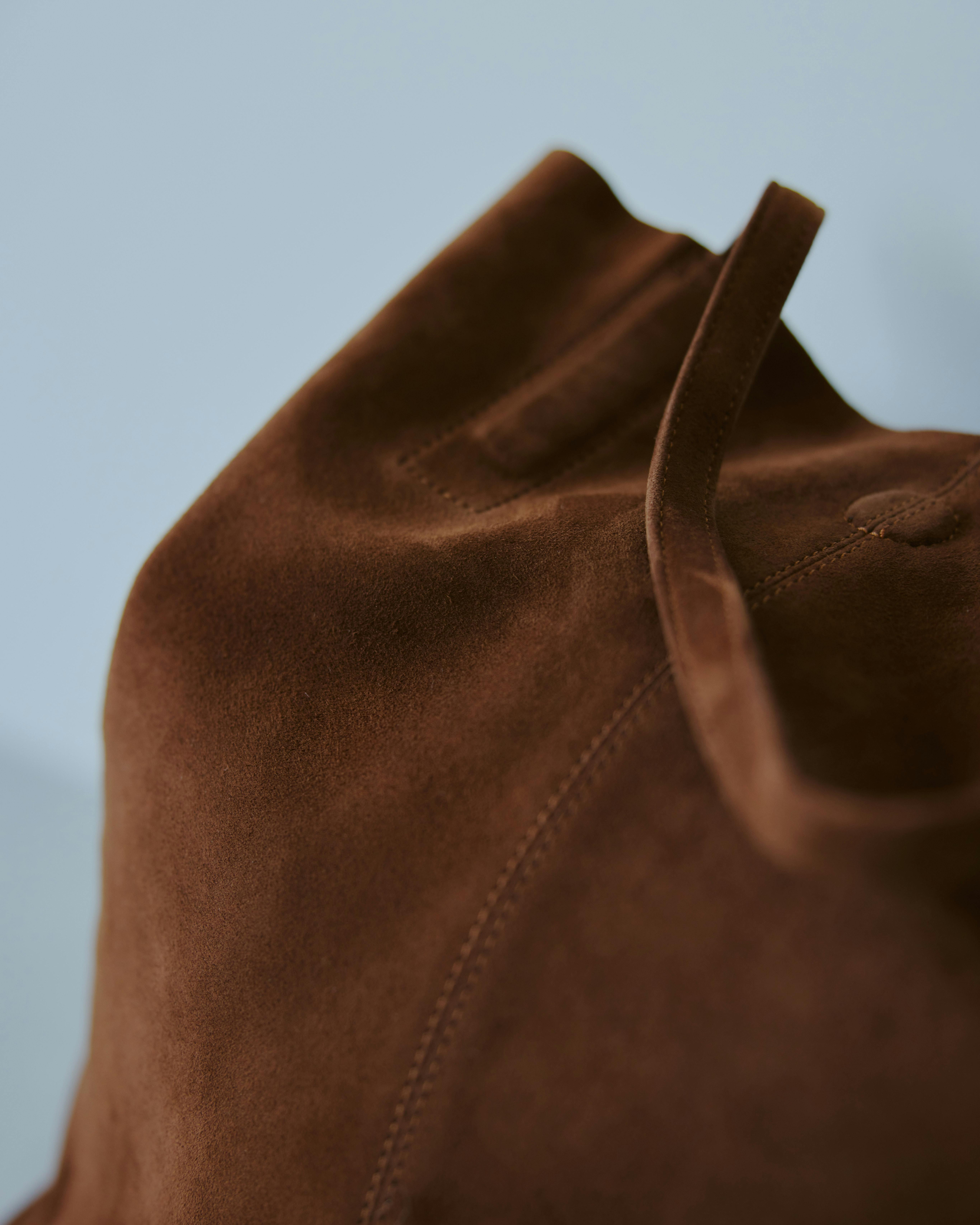 スエードならではの質感と、キャメルのようなニュアンスのある深いブラウンで、程よいラフさをまとえるところが魅力。