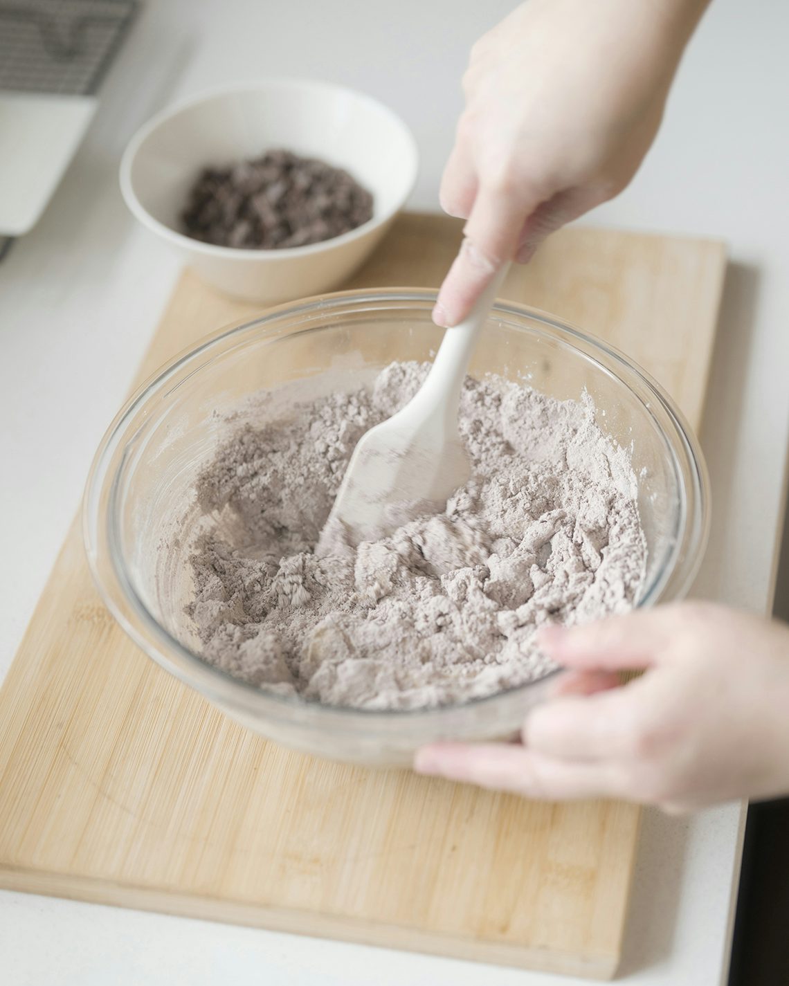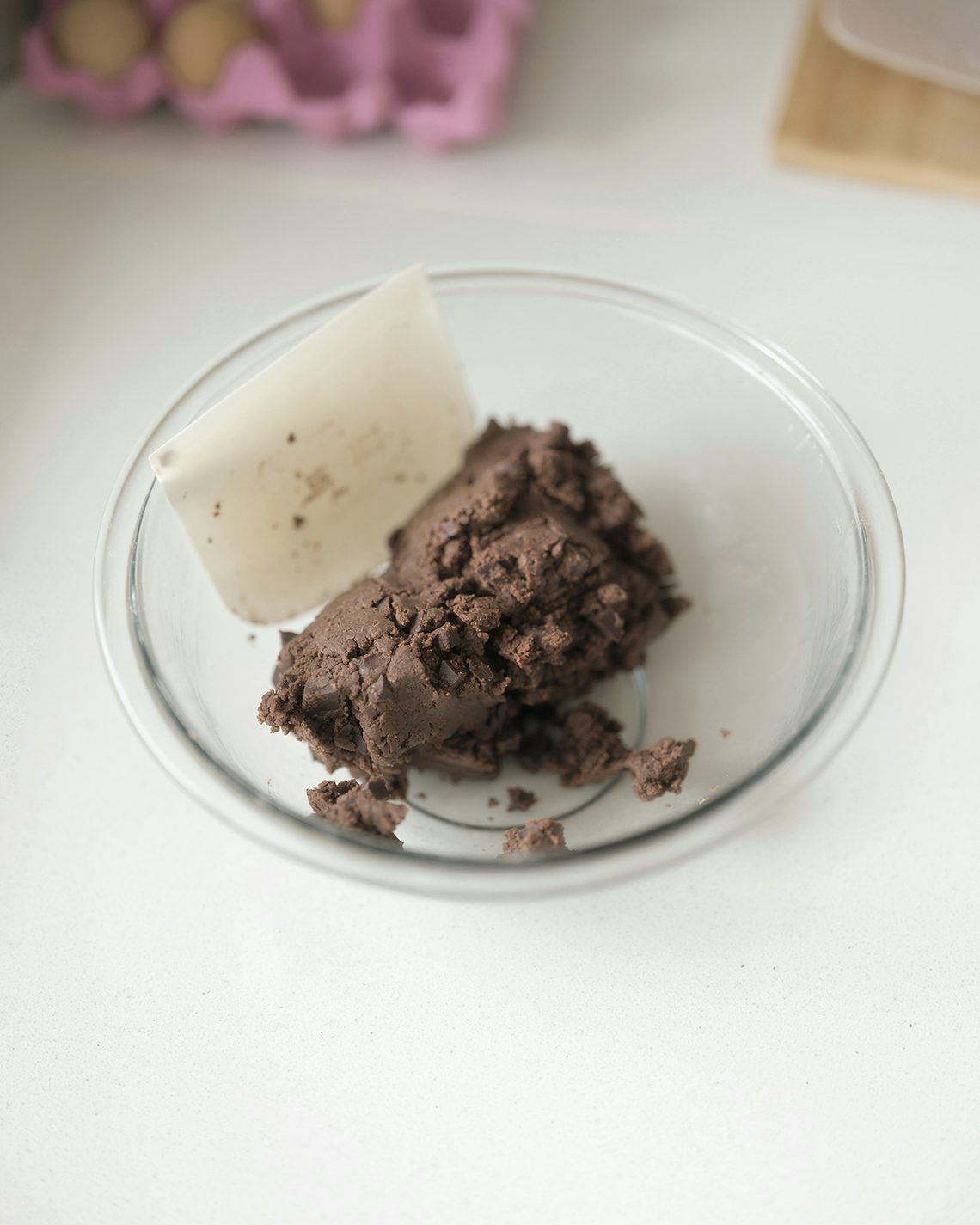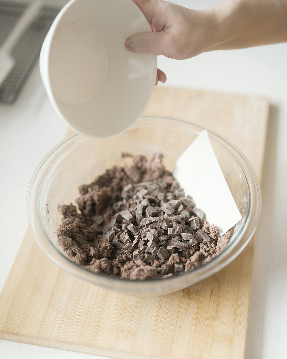 生地の色が濃くなってきたらカードに持ち替え、チョコレートを全量入れて、生地がまとまるように少し力を加えながら、ときどき底からすくい上げるように切り混ぜる。