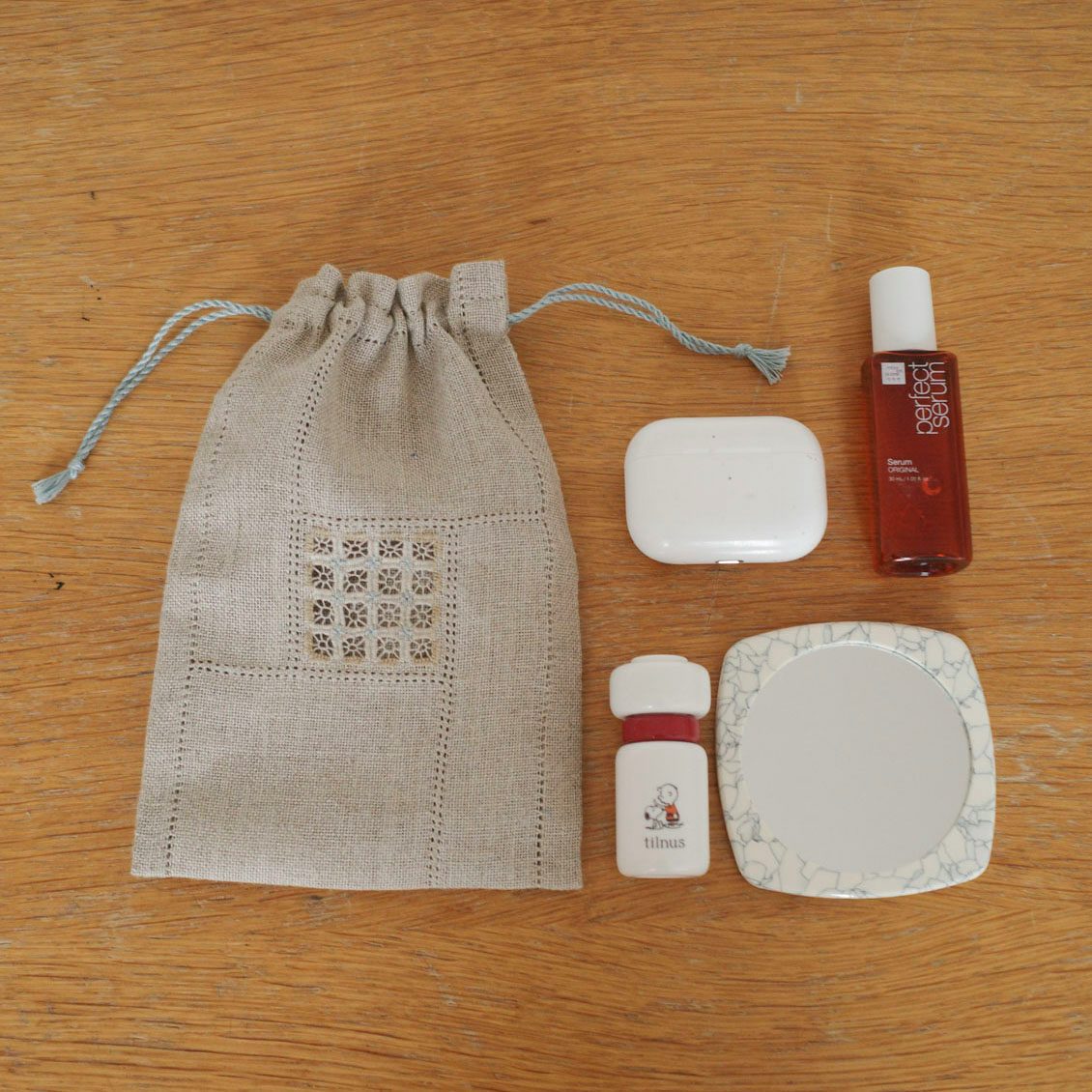 「ポーチは、工芸学校の刺繍の授業で、初期に制作したアイテムです。デンマークの伝統工芸である『HEDEBO(へデボ)刺繍』の技法を用いて作った小さな巾着で、持ち手部分の紐も刺繍糸から手作りしており、手間がかかった分、大切に丁寧に使っています。