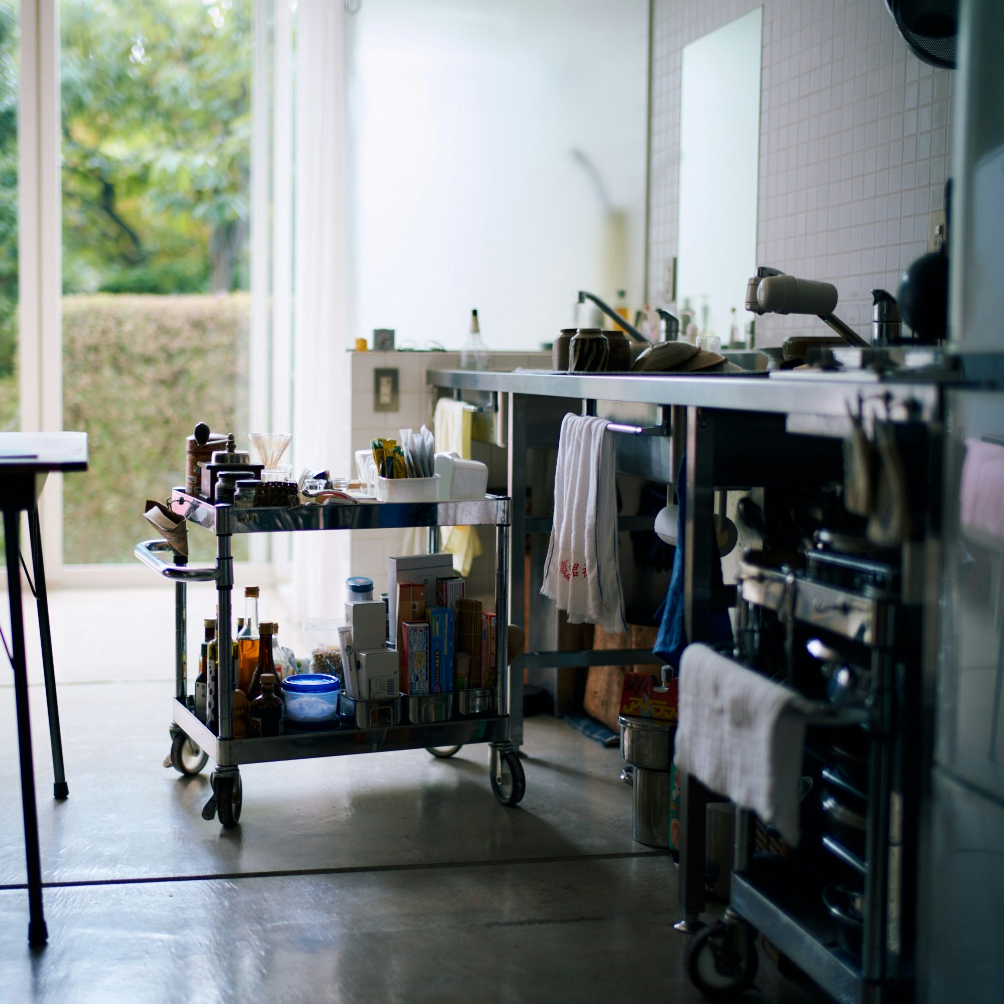 ワゴンも含めてキッチン全体がステンレスで、磁石がくっつくのも嬉しいポイント。