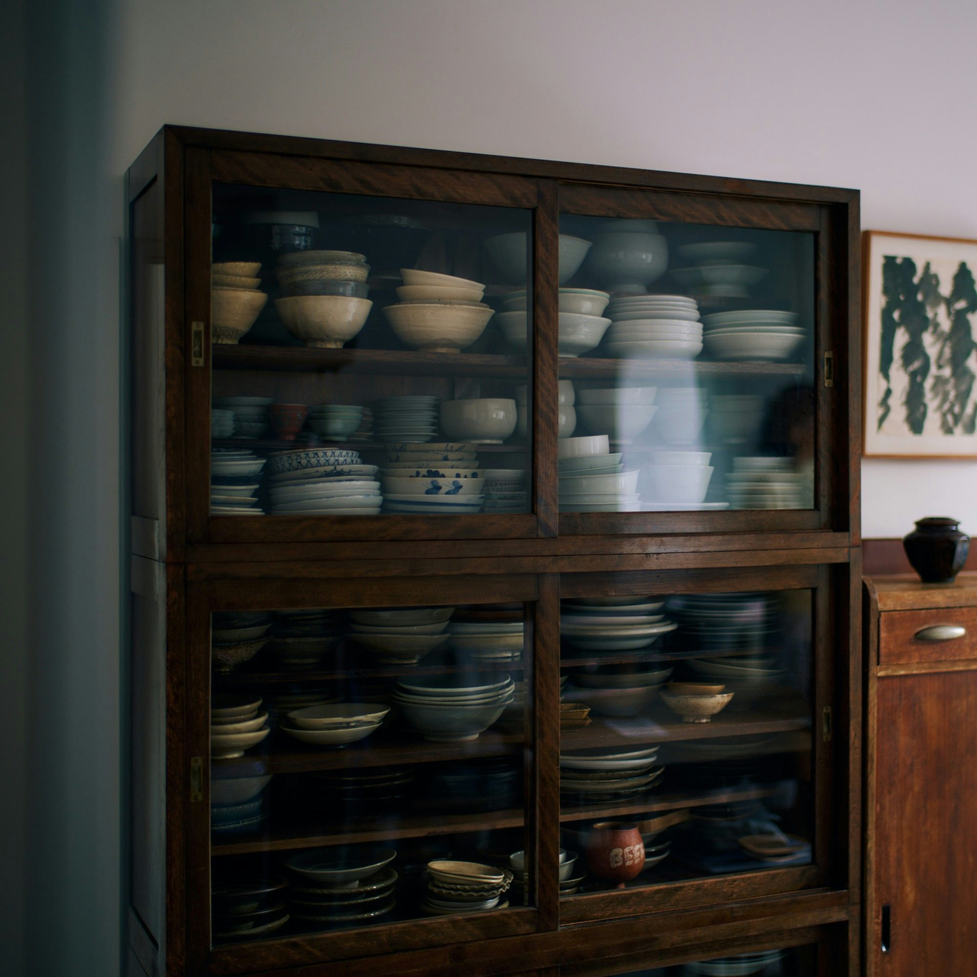 ワンルームの部屋にどっしりと構える食器棚の中には、数え切れないほどの器が納められています。