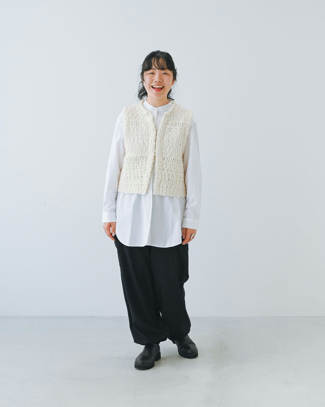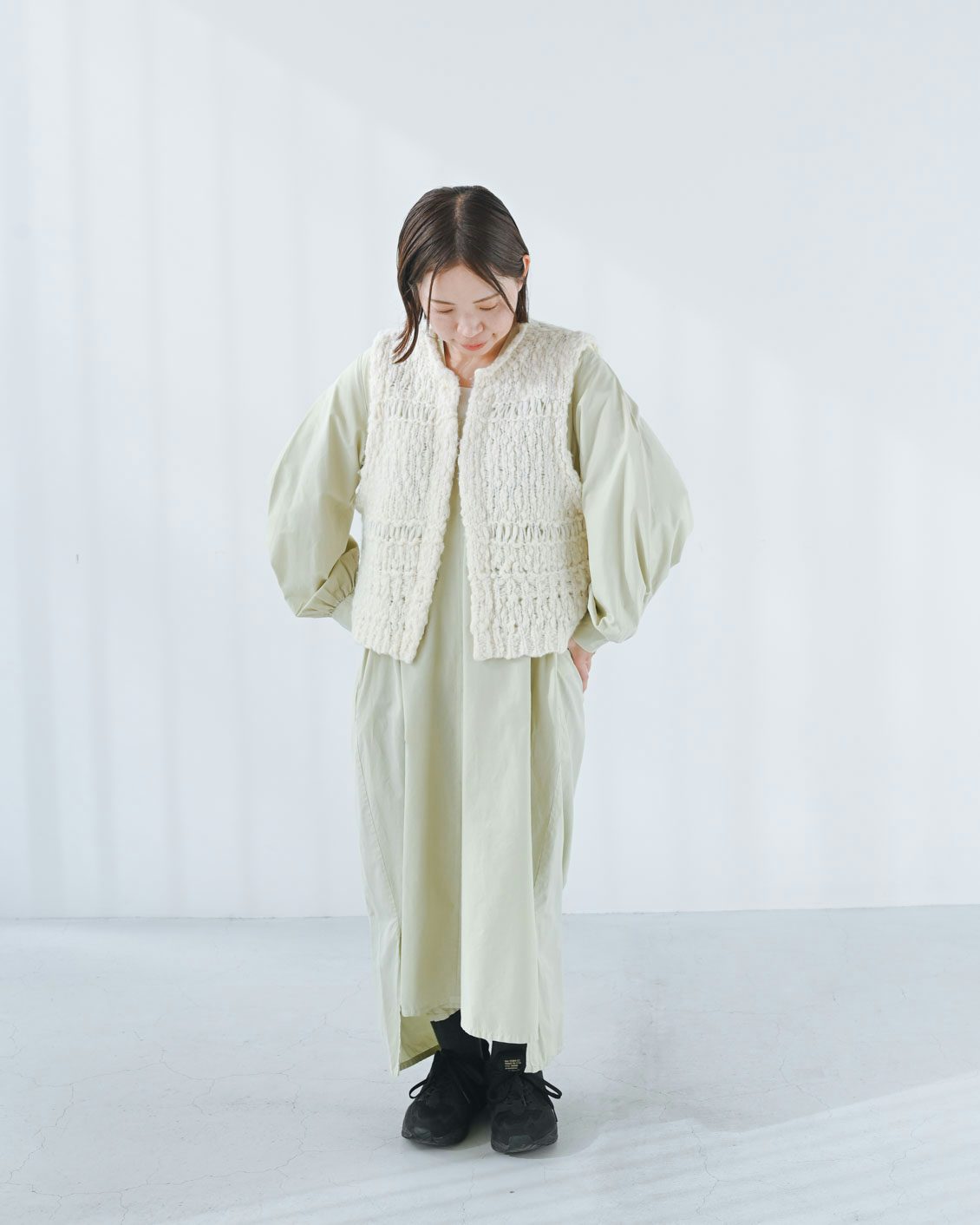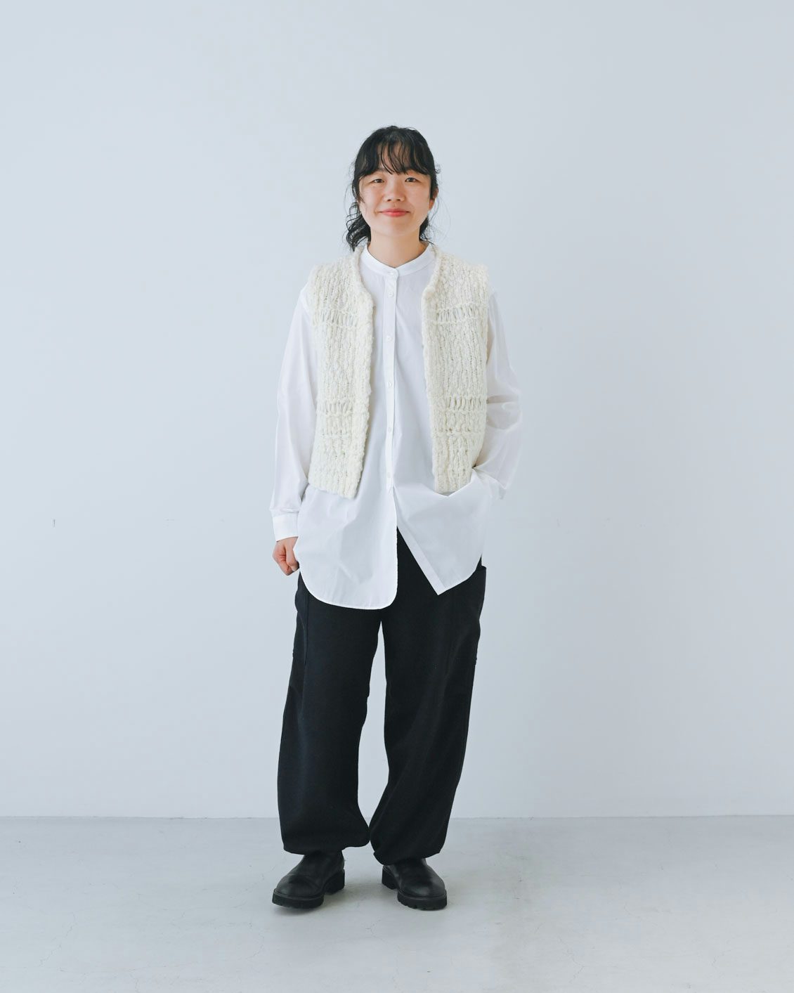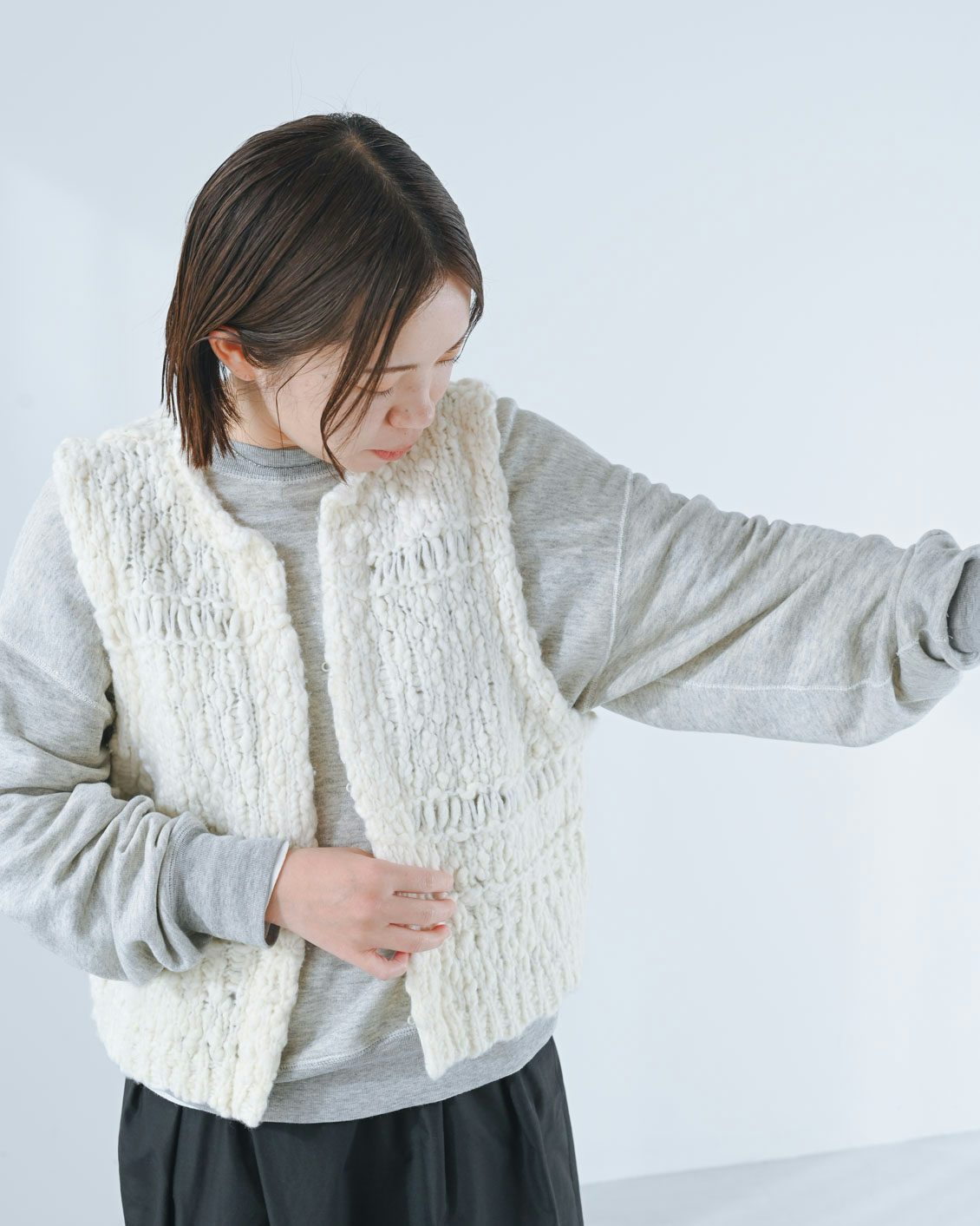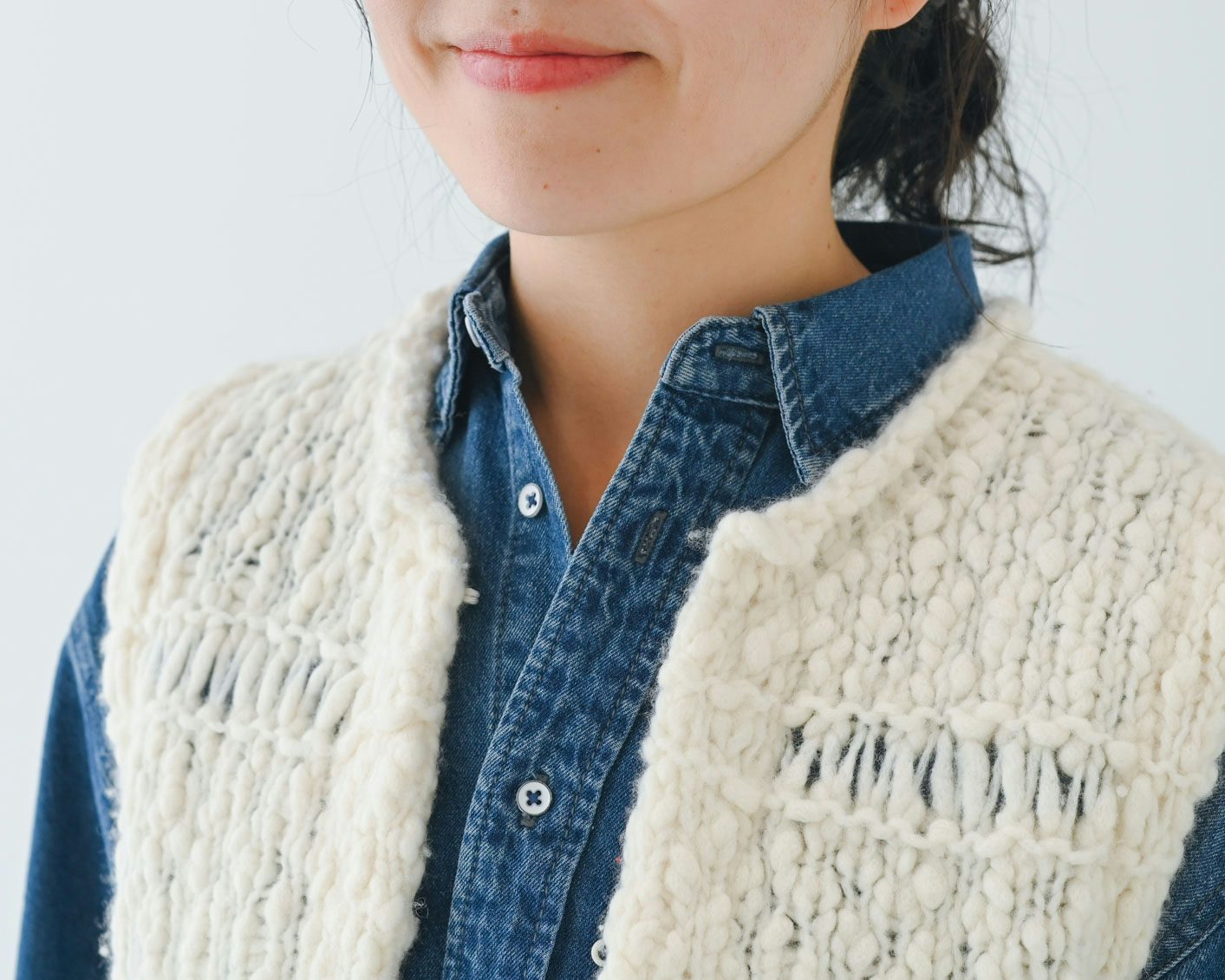 重ねるアイテムって、何に合わせよう?と迷うものもあるのですが、これはポコポコした立体的な編み地のおかげで冬はニットにも合うし、シャツ、カットソーと幅広い素材の服に合わせられて、秋〜春先まで長く使えそう。