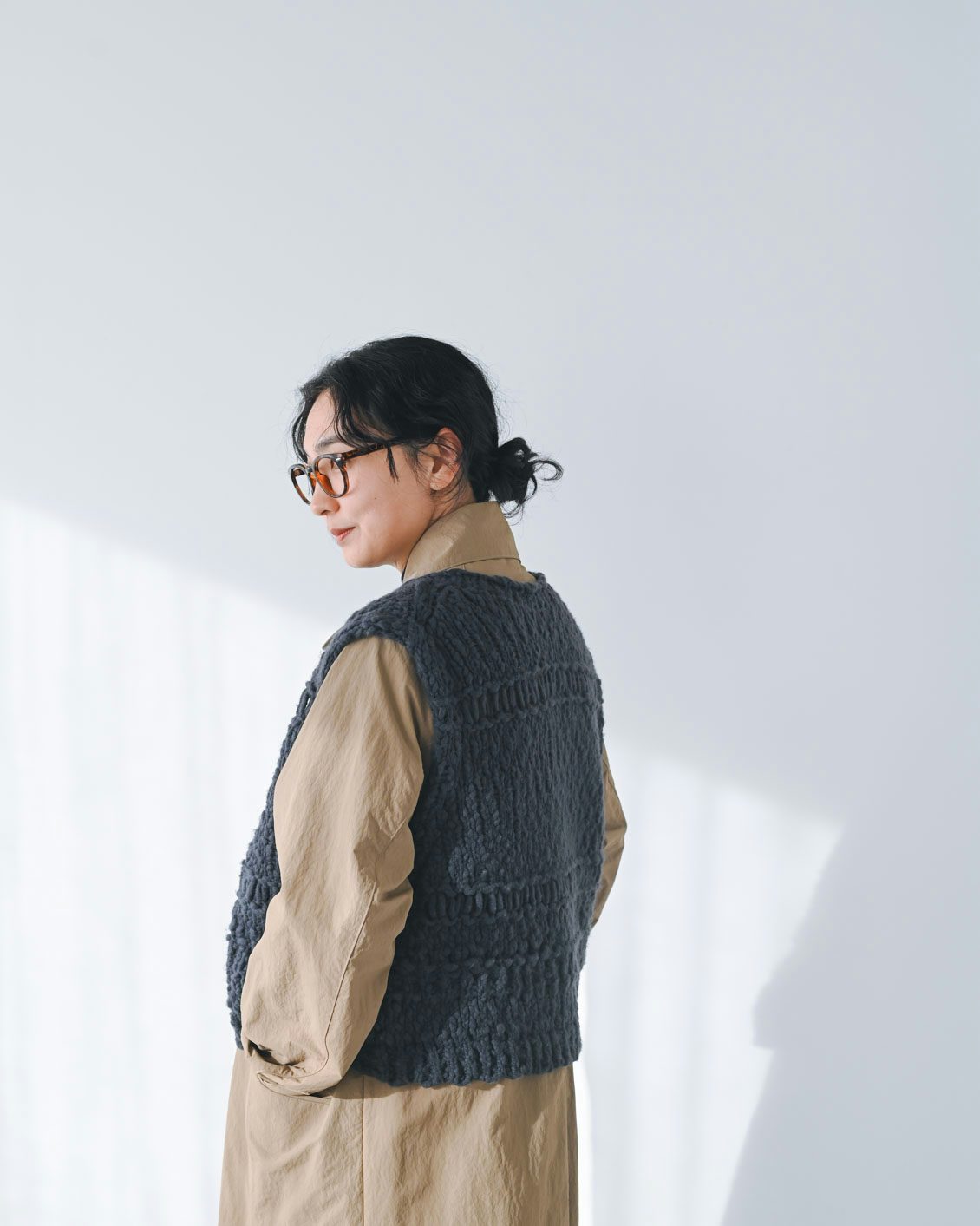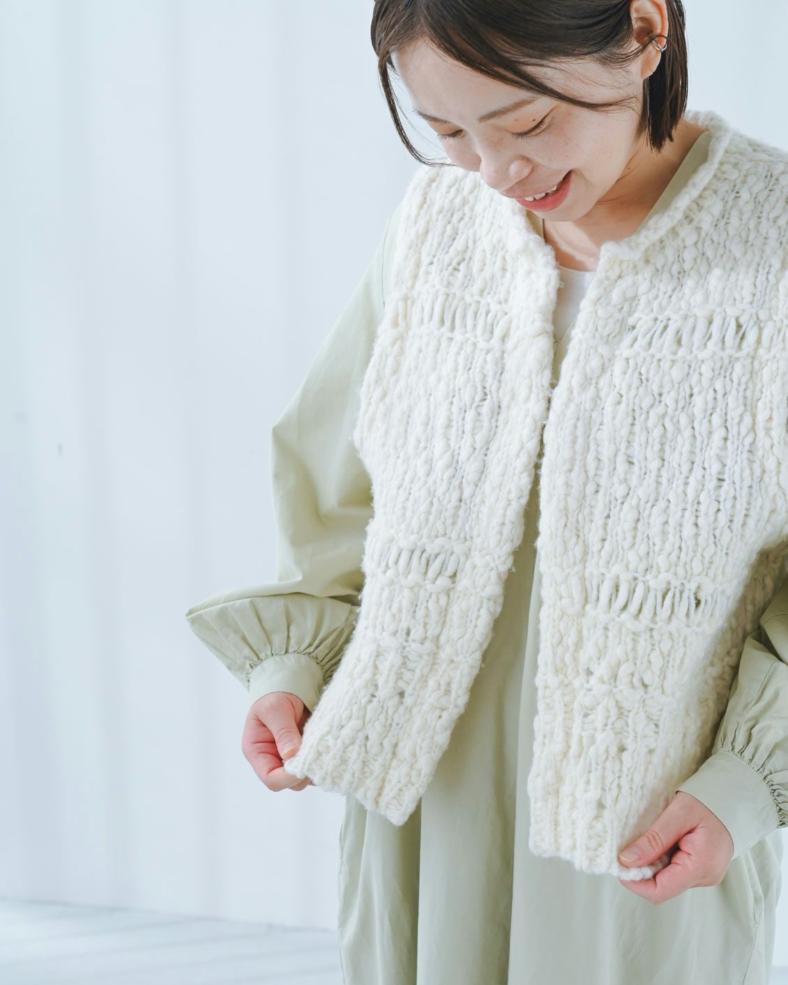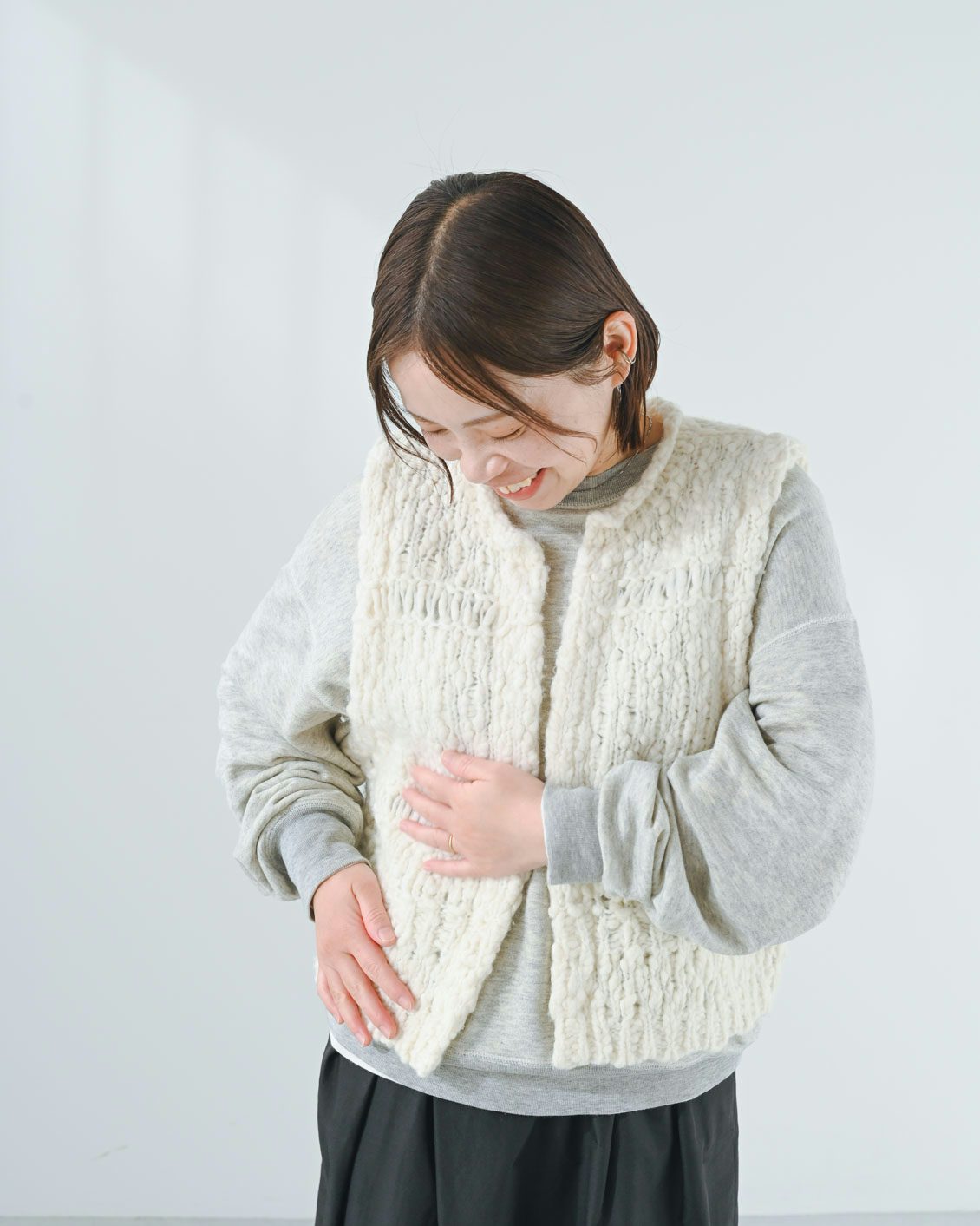 編み地の凹凸が、気になる体のラインをいい具合にカバーしてくれて安心感があります」