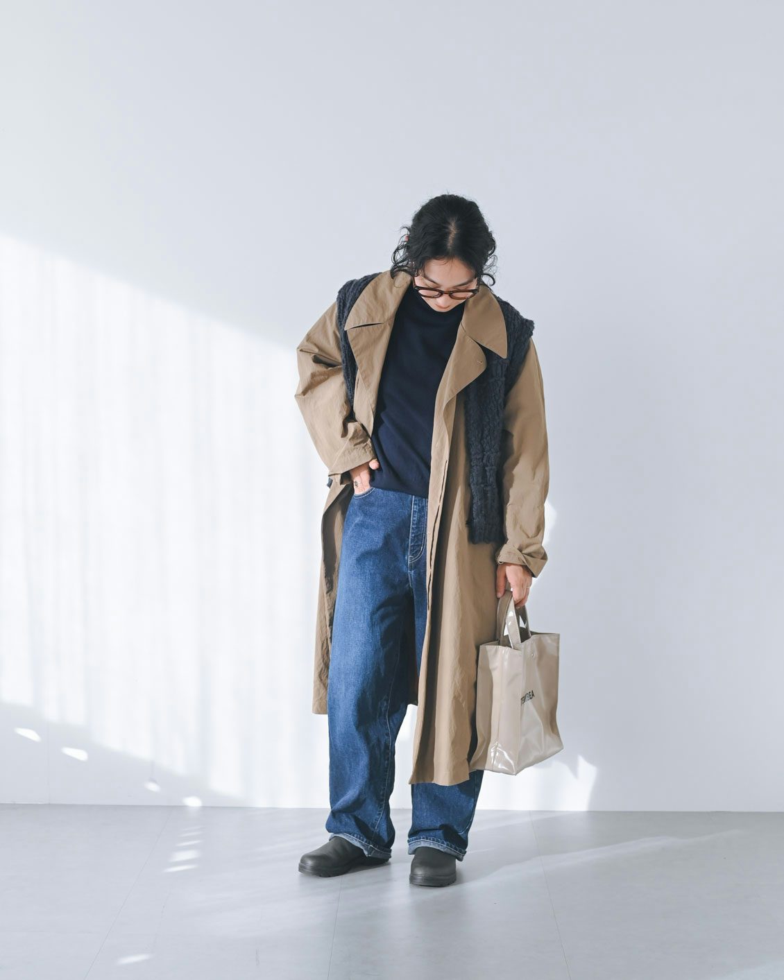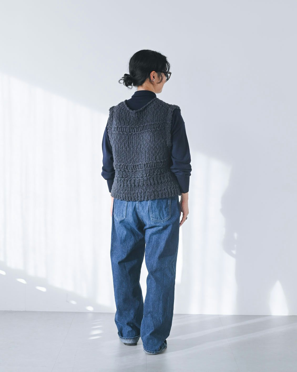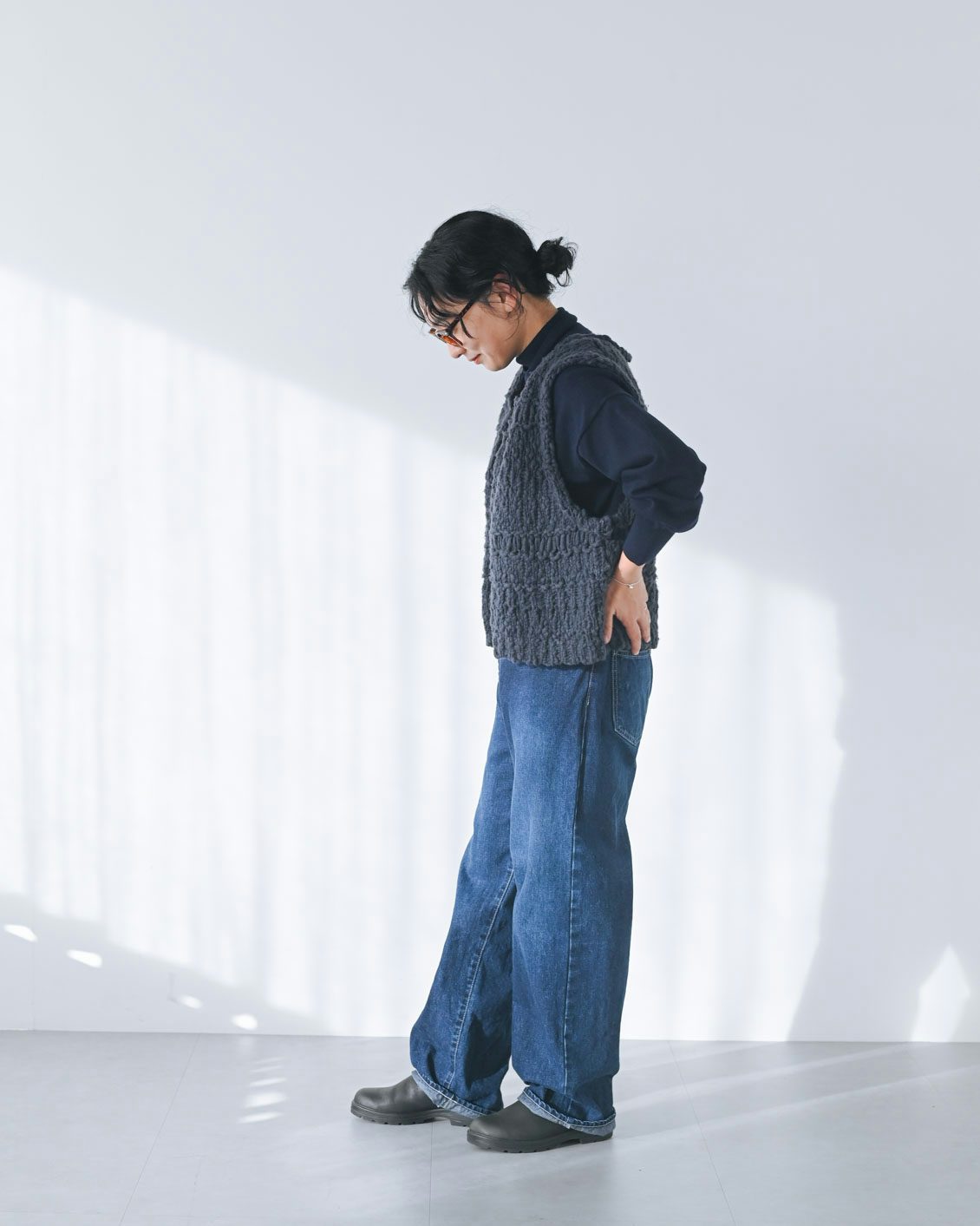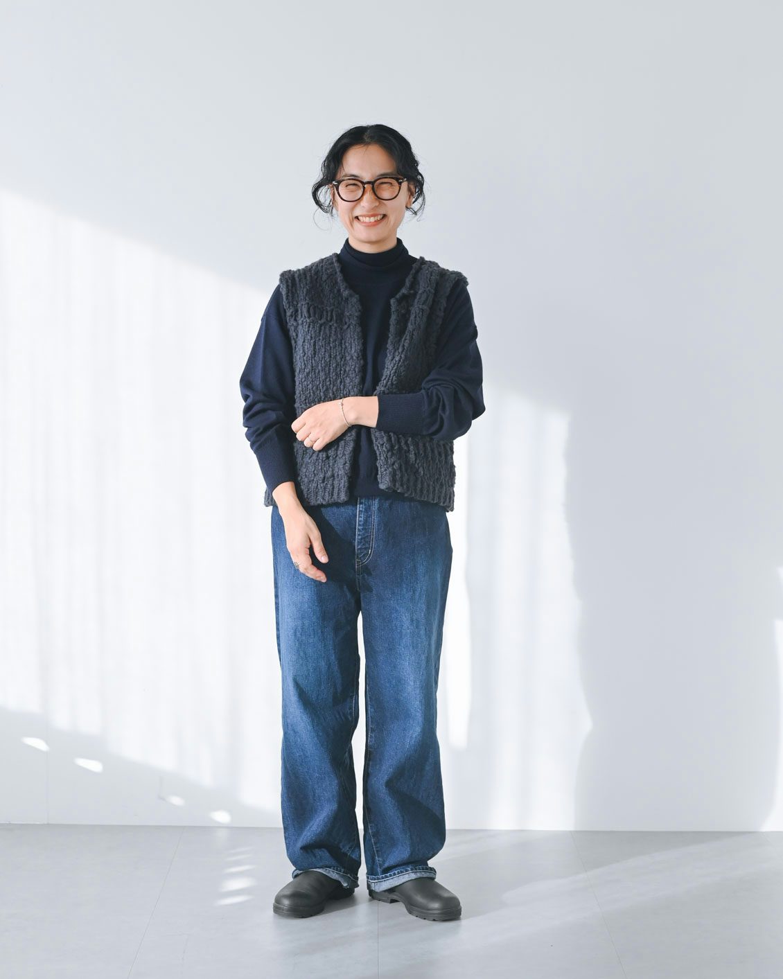 「まずは、ネイビーのハイネックニットとデニムに合わせてラフに着てみました。