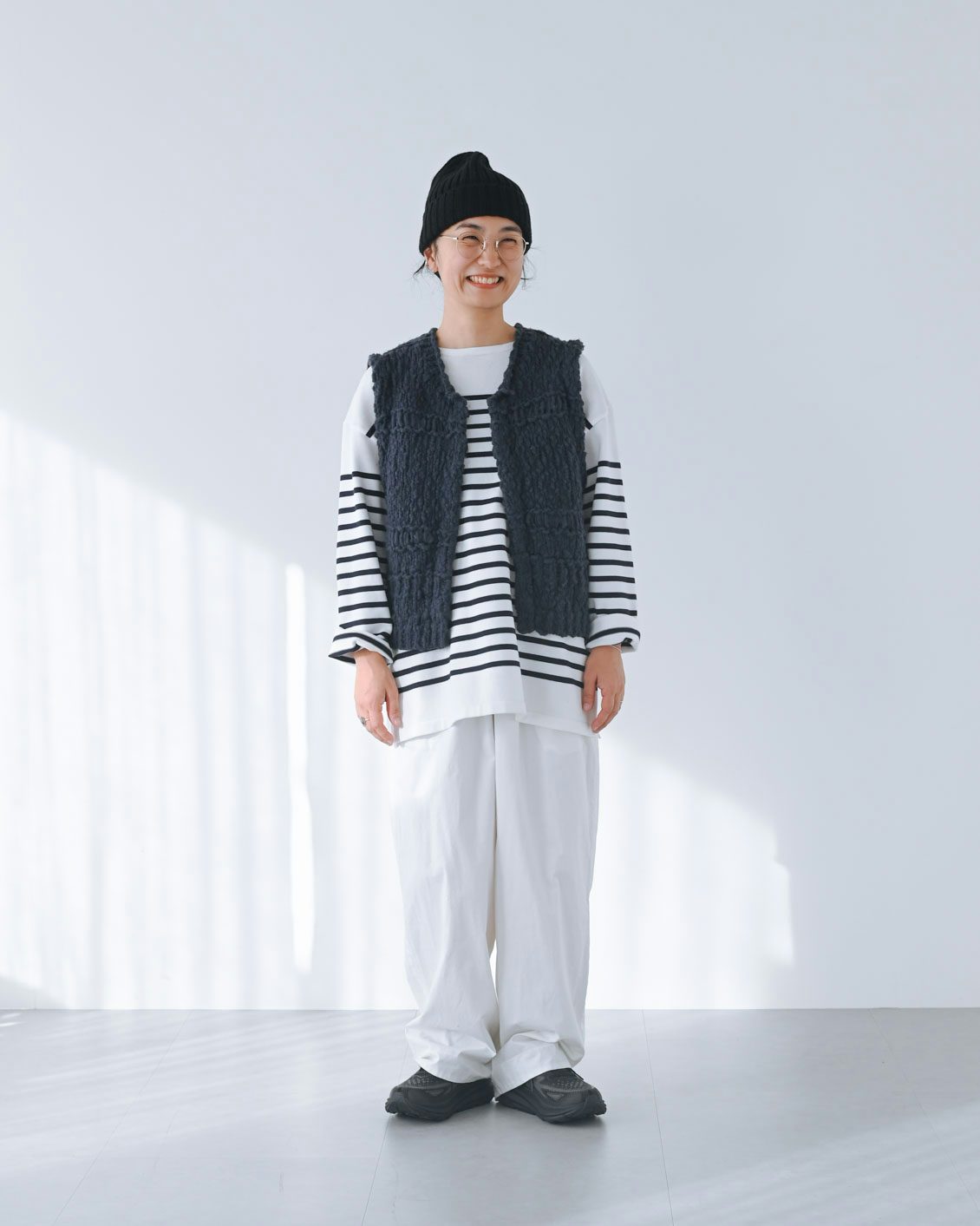 「スミクロは、グレーやネイビーのような感覚で合わせられる軽やかな黒。なのでこういったホワイトコーデに合わせてもコントラストが強くなりすぎず、柔らかい印象で着られるなと思いました。